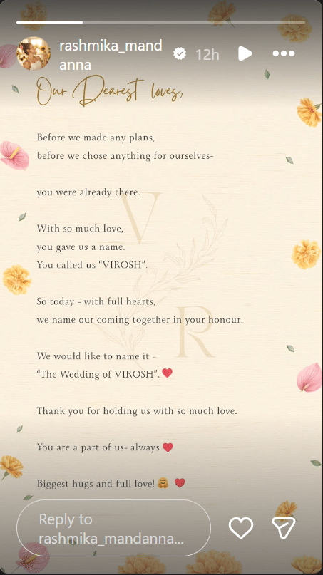 इससे पहले रविवार यानी 22 फरवरी को विजय देवरकोंडा और रश्मिका मंदाना ने आखिरकार अपने रिश्ते को लेकर आधिकारिक घोषणा की। साथ ही अपनी शादी की जानकारी देते हुए फैंस का आभार जताया, जिन्होंने उन्हें 'विरोश' नाम दिया।
