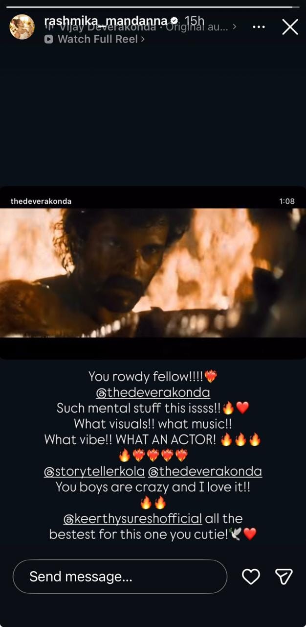 रश्मिका मंदाना ने अपने इंस्टाग्राम की स्टोरी पर इस टाइटल वीडियो को शेयर किया है। इसके साथ ही इस पर खुशी जताते हुए अभिनेत्री ने लिखा, ‘वाह, क्या गजब का है ये। ये तो कमाल की चीज है! क्या विजुअल्स हैं! क्या म्यूजिक है! क्या वाइब है! क्या एक्टर है! विजय देवरकोंडा और रवि किरण कोला आप दोनों कमाल हैं। मुझे ये बहुत पसंद आया। कीर्ति सुरेश आपको इस फिल्म के लिए ढेर सारी शुभकामनाएं, क्यूट।’