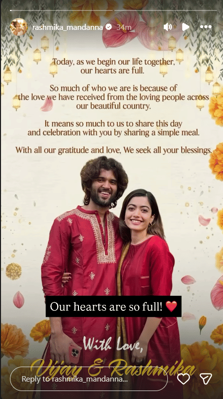 रश्मिका और विजय ने अपने फैंस के प्यार और आशीर्वाद के लिए शु्क्रिया अदा किया और अपनी इंस्टाग्राम स्टोरी पर एक तस्वीर के साथ प्यार भरा नोट भी लिखा। रश्मिका ने लिखा, 'आज हम दोनों अपनी जिंदगी की नई शुरुआत साथ कर रहे हैं, तो हमारा दिल भावुक हो गया है। हम जो भी आज हैं, उसमें बहुत बड़ा हिस्सा हमारे प्यारे देश के अच्छे लोगों के प्यार की वजह से है। इस खास दिन को और इस खुशी को आपके साथ सादा-सा खाना शेयर करके मनाना हमारे लिए बहुत मायने रखता है। पूरे दिल से शुक्रिया और ढेर सारा प्यार। कृपया हमें अपना आशीर्वाद दें।'