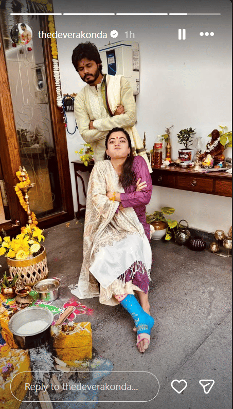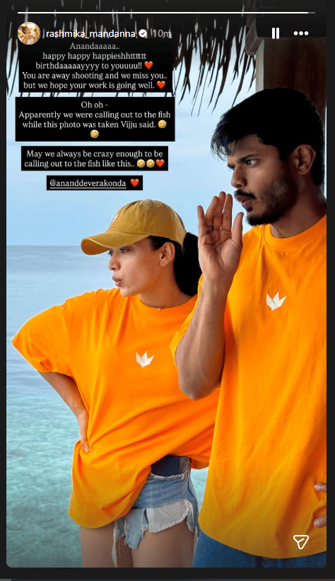 रश्मिका मंदाना ने पति विजय देवरकोंडा के भाई आनंद के जन्मदिन पर इंस्टाग्राम स्टोरी पर एक बहुत प्यारी फोटो शेयर की है। उन्होंने आनंद को जन्मदिन की बधाई देते हुए लिखा, 'आनंद देवरकोंडा, आपको जन्मदिन की ढेर सारी शुभकामनाएं। आप शूटिंग के लिए बाहर गए हुए हैं, हम सब आपको बहुत याद कर रहे हैं। उम्मीद है आपका काम अच्छे से चल रहा होगा। विज्जू ने बताया कि जब ये फोटो क्लिक हुई थी, तब हम मछलियों को आवाज दे रहे थे। काश हम हमेशा ऐसे ही मछलियों को बुलाने के लिए इतने पागल बने रहें।'