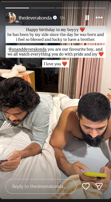 विजय देवरकोंडा ने अपने छोटे भाई आनंद देवरकोंडा को जन्मदिन की शुभकामनाएं दीं। विजय ने इंस्टाग्राम स्टोरी पर आनंद और रश्मिका के साथ कई तस्वीरें शेयर कीं और कैप्शन में लिखा, 'मेरे प्यारे भाई को जन्मदिन की ढेर सारी शुभकामनाएं। जन्म से ही तुम मेरे साथ हो। तुम्हें भाई के रूप में पाकर मुझे बहुत खुशी होती है। आनंद, तुम सबसे प्यारा हो। मैं तुझसे बहुत प्यार करता हूं।'