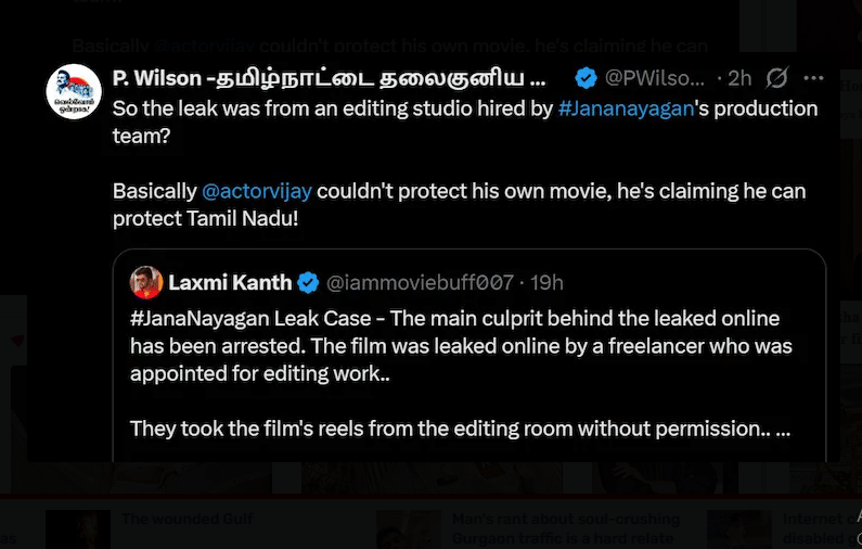सोशल मीडिया पर पोस्ट साझा कर राज्यसभा सांसद लिखा, 'तो क्या 'जन नायकन' को फिल्म की प्रोडक्शन टीम द्वारा किराए पर लिए गए एडिटिंग स्टूडियो से ही लीक किया गया? असल में, अभिनेता विजय अपनी ही फिल्म की रक्षा नहीं कर सके और वो दावा कर रहे हैं कि वे तमिलनाडु की रक्षा कर सकते हैं!'