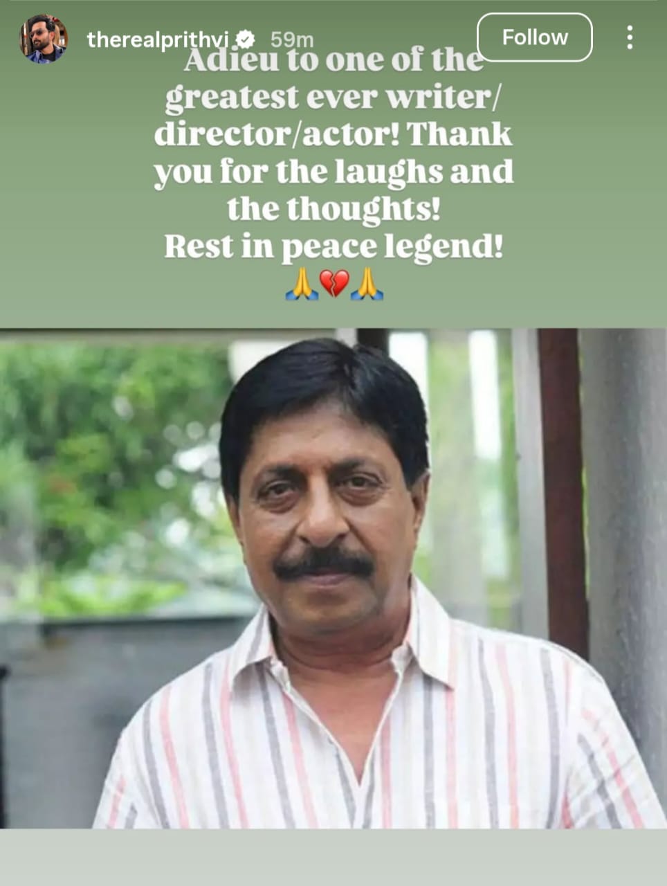 पृथ्वीराज सुकुमारन ने श्रीनिवासन के निधन पर शोक जताया