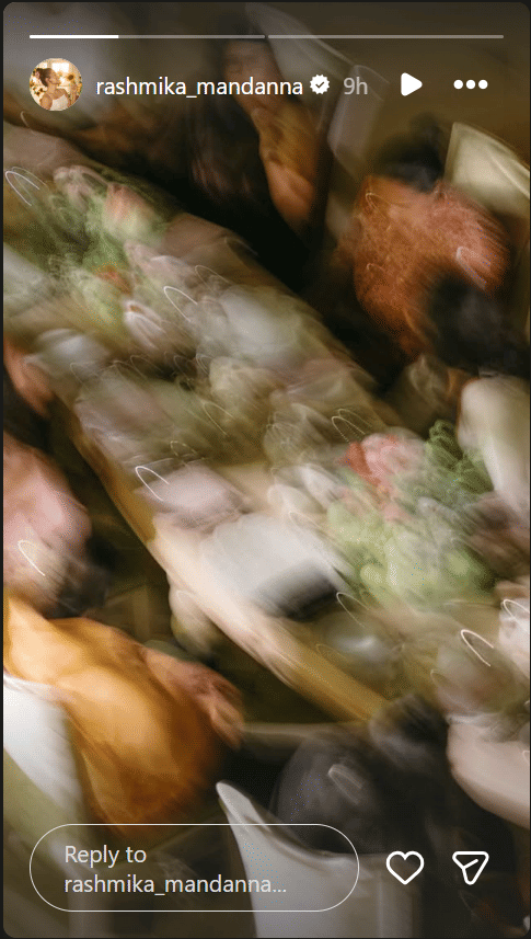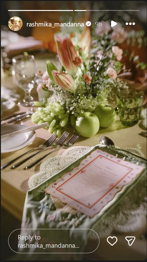 रश्मिका ने हाल ही में अपनी इंस्टाग्राम स्टोरी पर एक तस्वीर शेयर की, जिसमें उन्होंने फैंस को कपल के शानदार डिनर सेटअप की तस्वीरें दिखाईं। सुनहरी रोशनी में नहाया हुआ टेबल और पूरा माहौल बेहद खूबसूरत और रोमांटिक था।