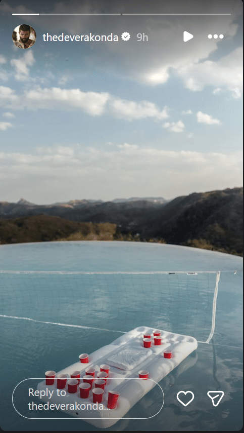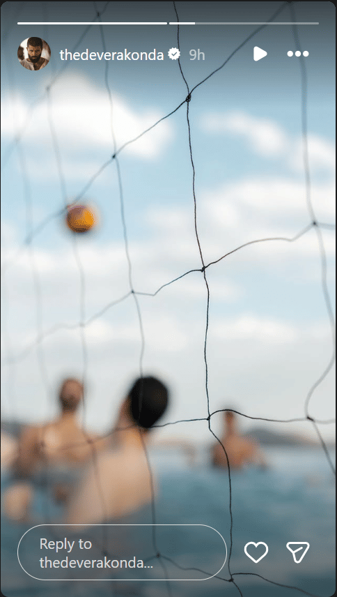 रश्मिका के अलावा विजय देवरकोंडा ने भी अपने इंस्टाग्राम पर कुछ स्टोरी साझा की हैं। इनमें उन्होंने शादी की प्री-वेडिंग मस्ती की झलक दिखाई है। विजय ने इंस्टाग्राम स्टोरीज में अपने दोस्तों के साथ पूल वॉलीबॉल खेलते हुए कुछ पल साझा किए। एक तस्वीर में वॉलीबॉल नेट के पीछे से खिलाड़ियों की परछाईं दिख रही है, जहां गेंद हवा में है, जिससे पता चलता है कि शादी में आए मेहमान मौज-मस्ती भरे माहौल का आनंद ले रहे हैं।