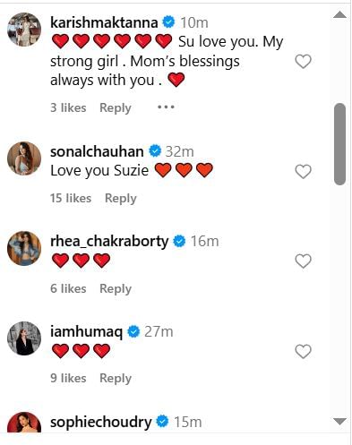 सुजैन खान की पोस्ट पर कई सेलेब्स ने कमेंट किए हैं। अभिनेत्री करिश्मा तन्ना ने लिखा है 'मैं तुमसे प्यार करती हूं। मां का आशीर्वाद हमेशा तुम्हारे साथ है।' सोनल चौहान ने लिखा है 'सुजैन मैं तुमसे प्यार करती हूं।' रिया चक्रवर्ती, हुमा कुरैशी, सोफी चौधरी और भावना पांडे ने दिल वाला इमोजी कमेंट किया है। इसके अलावा कई यूजर्स ने उनकी पोस्ट पर कमेंट किए हैं।