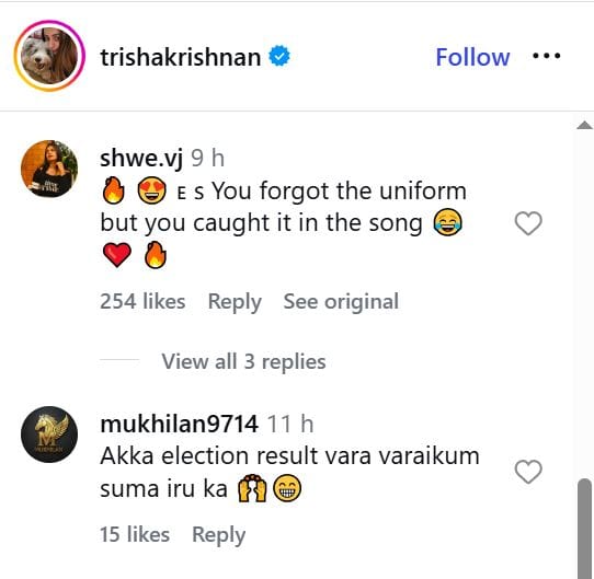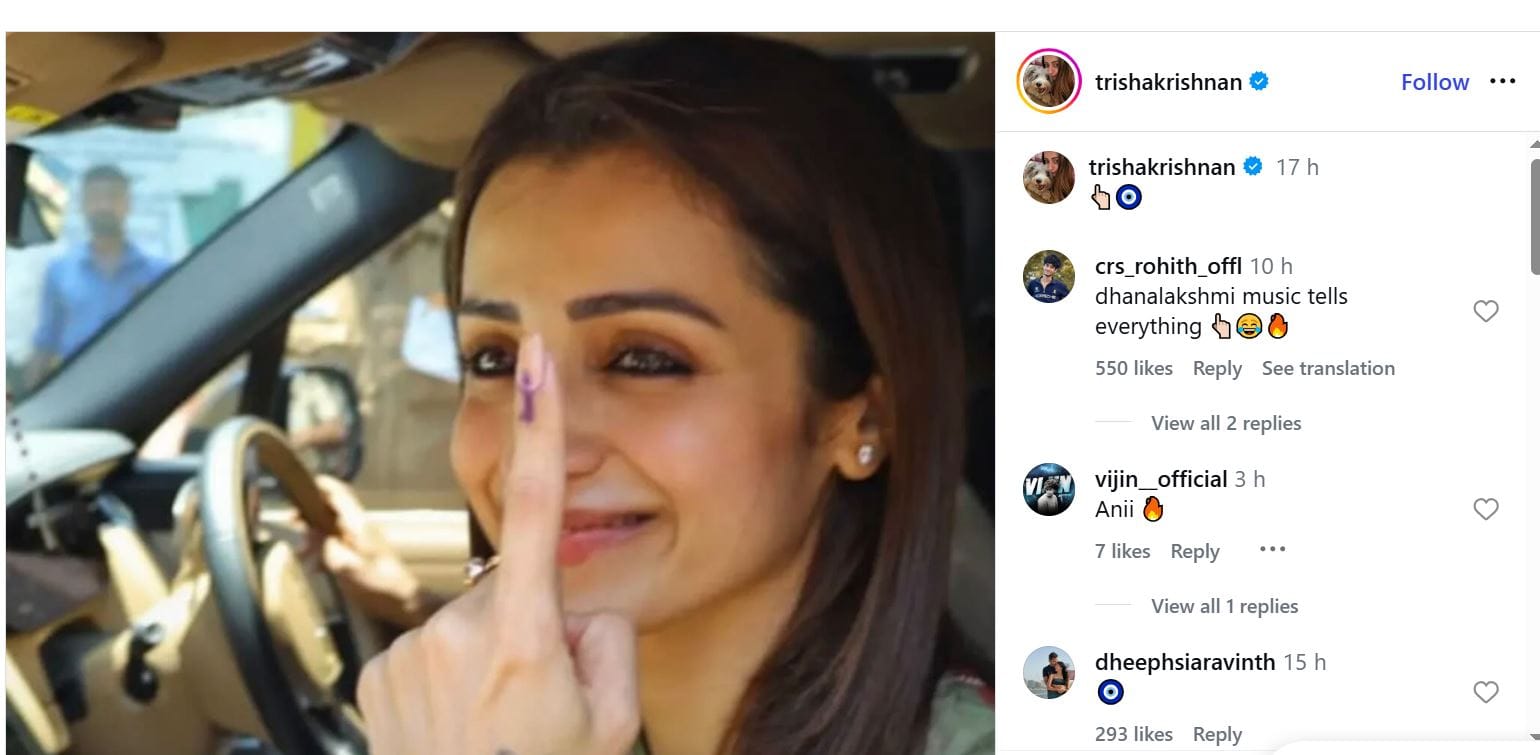 दरअसल, बीते दिन हुए तमिलनाडु विधानसभा चुनाव में तृषा कृष्णन भी वोट डालने पहुंचीं। कई और सितारों की तरह उन्होंने भी वोटिंग के बाद सोशल मीडिया पर पोस्ट साझा कर अन्य लोगों से भी मतदान की अपील की। तृषा ने इंस्टाग्राम पर एक फोटो साझा की। इसमें वे कार में बैठकर उंगली पर लगी स्याही को फ्लॉन्ट करती दिख रही हैं। उन्होंने कैप्शन में तो ज्यादा कुछ नहीं लिखा, सिर्फ इविल आई इमोजी बनाया है, लेकिन इसके साथ लगे गाने ने लोगों का ध्यान खींच लिया है।