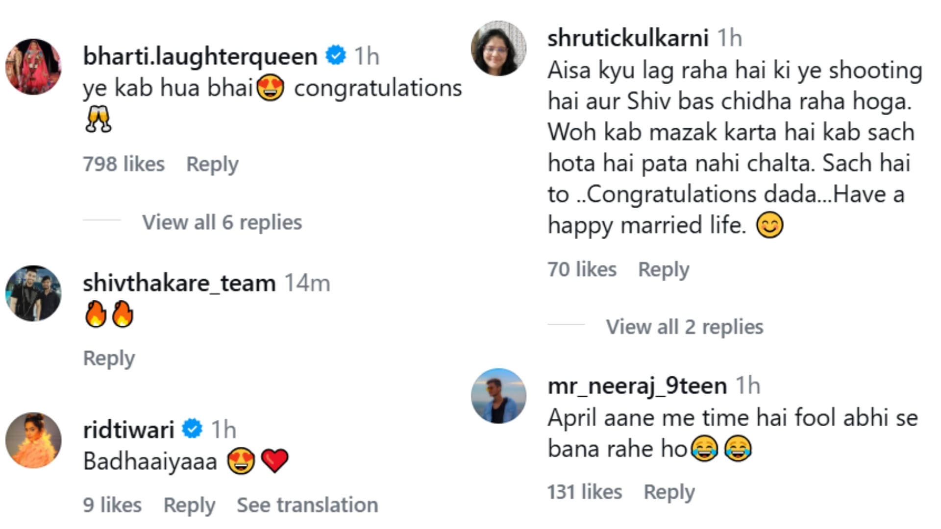 शिव ठाकरे की शादी वाली पोस्ट पर कॉमेडियन भारती सिंह ने कमेंट करते हुए लिखा, ‘ये कब हुआ? बधाई हो।’ इसके अलावा एक्ट्रेस रिद्धिमा तिवारी ने भी बधाई दी है। ऐसा लगता है कि शिव ठाकरे की शादी की खबर टीवी इंडस्ट्री से जुड़े लोगों को भी नहीं पता थी। शिव ने लगता है, उन्हें सरप्राइज दिया है।