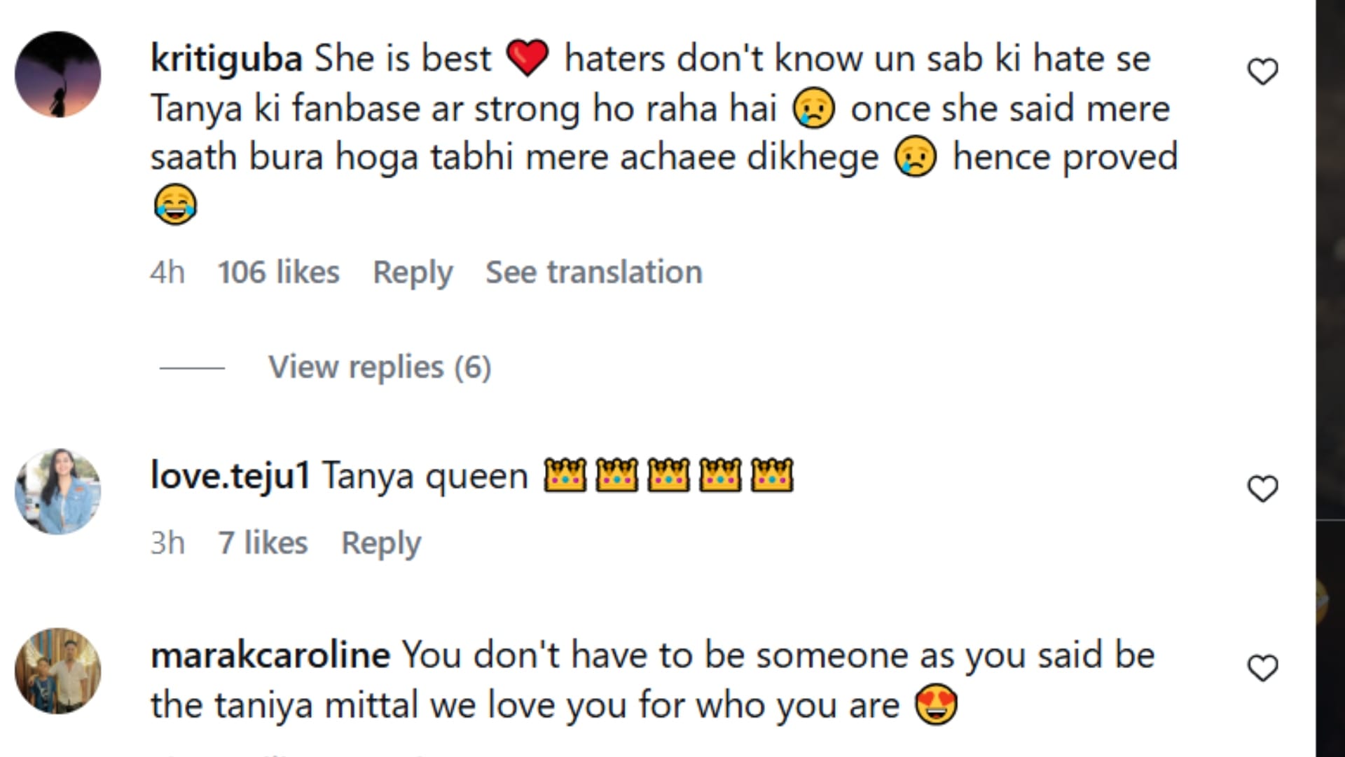 तान्या के इस बयान पर कई यूजर्स ने उन्हें सपोर्ट किया। एक यूजर ने लिखा, ‘तान्या क्वीन है।’ एक अन्य यूजर ने कमेंट किया, ‘आप सबसे अच्छी है। हेटर्स को पता नहीं है कि उन सब की हेट से तान्या का फैनबेस और स्ट्रॉन्ग हो रहा है।’ इसी तरह एक फैन ने कमेंट किया, ‘आपको कोई और बनने की जरूरत नहीं है जैसा आपने कहा तान्या मित्तल बनो, हम आपको वैसे ही प्यार करते हैं, जैसी आप हैं।’