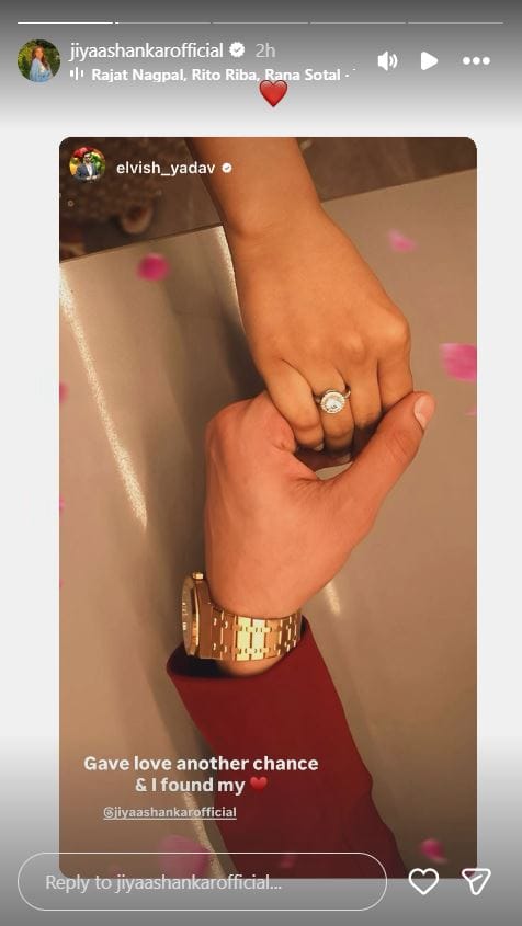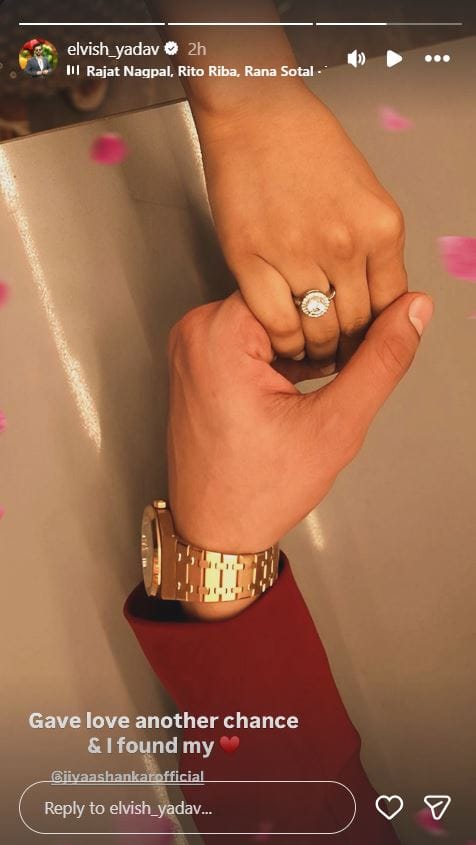 दरअसल एल्विश यादव ने अपनी इंस्टाग्राम स्टोरीज पर एक तस्वीर शेयर की है। इसमें एक लड़के ने एक लड़की का हाथ पकड़ा हुआ है। लड़की ने हाथ में रिंग पहनी हुई है। इसके कैप्शन में लिखा है 'प्यार को दूसरा मौका दिया और मुझे मेरा प्यार मिल गया।' इस स्टोरी को जिया शंकर ने अपनी इंस्टाग्राम स्टोरीज पर रीशेयर किया है।