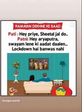 दीपिका ने इंस्टाग्राम स्टोरी पर एक पोस्ट साझा किया है। इस पोस्ट में दीपिका ने एक जोक्स शेयर किया जो रामायण देखने के बाद पत्नी ने पति से कहा। दीपिका ने इस पोस्ट में लिखा- 'रामायण देखने के बाद...पति- हे प्रिय, शीतल जल दो। पत्नी- हे आर्यपुत्र, स्वयं लेने की आदत डालें। लॉकडाउन है वनवास नहीं।'