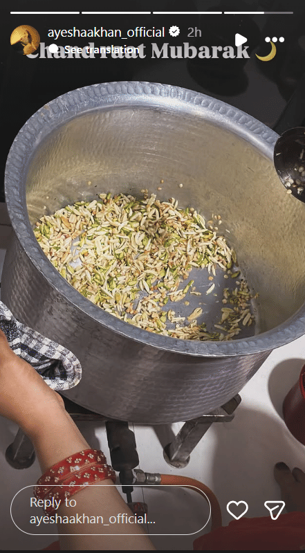 'धुरंधर' के गाने 'शरारत' से प्रसिद्ध हुईं आयशा खान ने भी अपने फैंस को ईद की शुभकामनाएं दी हैं। आयशा ने इंस्टाग्राम स्टोरी पर खाने की एक तस्वीर शेयर की है। इसके साथ आयशा ने लिखा, 'चांद रात मुबारक।'