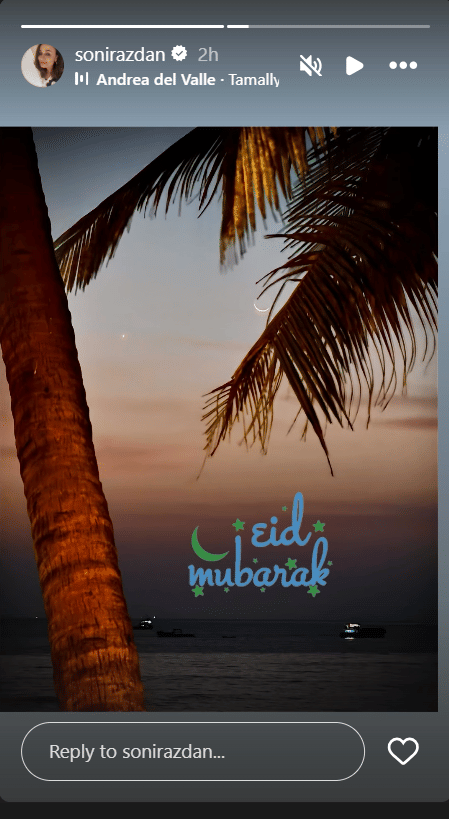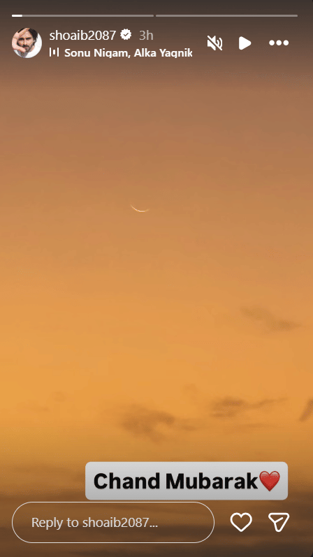 टीवी अभिनेता शोएब इब्राहिम ने भी अपने फैंस को ईद की शुभकामनाएं दी हैं। शोएब ने इंस्टाग्राम स्टोरी पर चांद की एक तस्वीर शेयर की है। इसके साथ शोएब ने लिखा, 'चांद मुबारक'। इसके साथ ही शोएब ने लाल दिल वाला इमोजी भी बनाया।