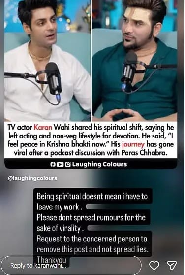 करण वाही ने अपने इंस्टाग्राम स्टोरी पर एक पोस्ट का जवाब दिया, जिसे बाद में हटा दिया गया था। उस पोस्ट में कहा गया था कि अभिनेता ने आध्यात्मिकता पर ध्यान केंद्रित करने के लिए अभिनय से दूरी बनाने का फैसला किया है। इस पोस्ट को स्टोरी पर साझा करते हुए करण ने कैप्शन में लिखा, ‘आध्यात्मिक होने का मतलब यह नहीं है कि मुझे अपना काम छोड़ना होगा। कृपया वायरल होने के लिए अफवाहें न फैलाएं। संबंधित व्यक्ति से अनुरोध है कि इस पोस्ट को हटा दें और झूठ न फैलाएं। धन्यवाद।’