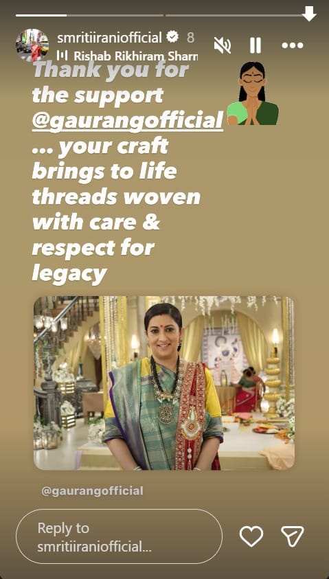 सीरियल में तुलसी (स्मृति ईरानी) की साड़ियों के डिजाइन की खूब तारीफ हो रही है। इसके पीछे डिजाइनर गौरांग शाह का हाथ है। हाल ही में स्मृति ईरानी ने उनका शुक्रिया अदा किया है। गौरांग शाह इंटरनेशनल स्तर पर लोकप्रिय डिजाइनर हैं। क्राफ्ट और परंपराओं के अनूठे संगम के साथ उन्होंने तुलसी के लिए खास साड़ियां तैयार की हैं। हाल ही में गौरांग ने स्मृति ईरानी का एक फोटो अपने इंस्टाग्राम अकाउंट से शेयर किया, जिसमें वे साड़ी पहने दिख रही हैं। स्मृति ईरानी ने अपनी इंस्टा स्टोरी पर यह पोस्ट साझा किया है।