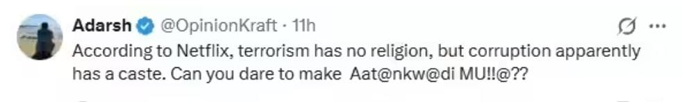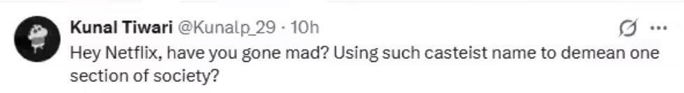 सोशल मीडिया पर एक यूजर ने लिखा है 'नेटफ्लिक्स के मुताबिक आतंकवाद का कोई भी धर्म नहीं होता, लेकिन भ्रष्टाचार की एक बिरादरी होती है।' एक दूसरे यूजर ने लिखा है 'घूसखोर लिख देता तो क्या हो जाता?' एक और यूजर ने लिखा है 'फिल्म का टाइटल बदलो वरना इसका बॉयकॉट करेंगे।' एक और यूजर ने लिखा है कि 'नेटफ्लिक्स क्या आप पागल हो गए हो? क्या समाज के एक तबके को नीचा दिखाने के लिए ऐसे जातिवादी नाम का इस्तेमाल कर रहे हो?'