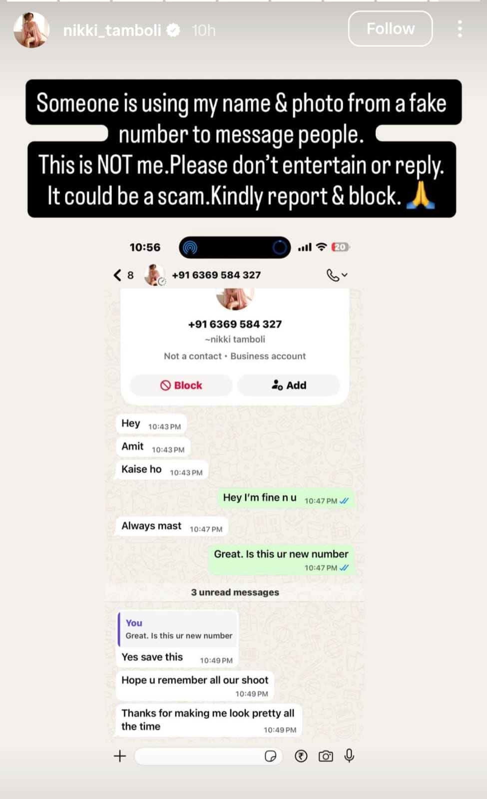 निक्की तंबोली ने इंस्टाग्राम पर एक पोस्ट साझा करते हुए एक नंबर और चैट शेयर की। जिसमें एक अनजान नंबर से उनके करीबी लोगों से कॉन्टैक्ट किया जा रहा है। इस पोस्ट के साथ निक्की लिखती हैं, ‘काेई मेरा नाम और तस्वीर इस्तेमाल करके फेक नंबर से लोगों को मैसेज कर रहा है। यह मैं नहीं हूं। प्लीज इस शख्स को अहमियत ना दें। रिप्लाई ना करें। यह स्कैम हो सकता है। कृपया इस नंबर को रिपोर्ट करें, ब्लॉक करें।’