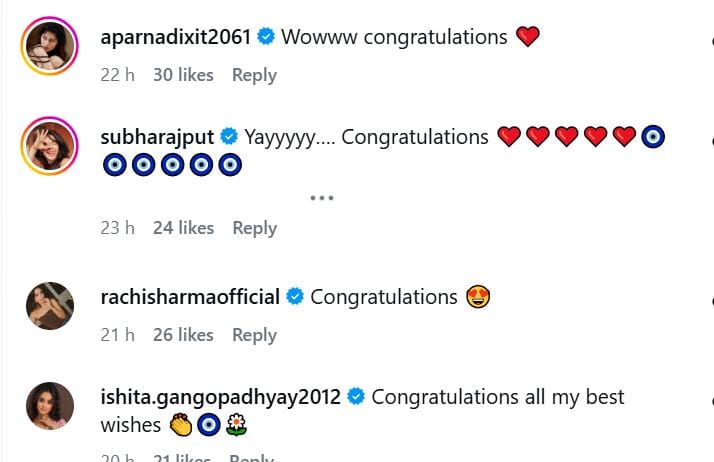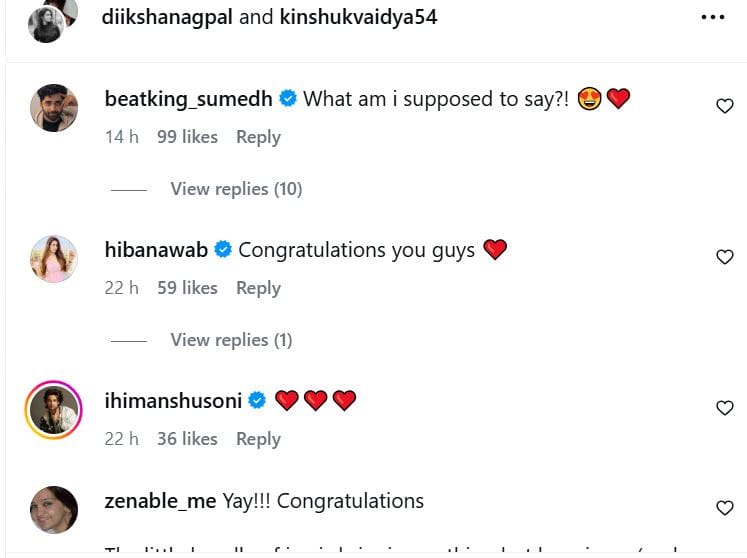 कपल के इस खुशखबरी वाले पोस्ट पर फैंस जमकर बधाई दे रहे हैं। परिवार में नन्हे मेहमान के आगमन पर नेटिजन्स खुश हैं। यूजर्स लिख रहे हैं, 'प्यारी जोड़ी को खूब मुबारक हो'। एक यूजर ने लिखा, 'ईश्वर आप दोनों पर कृपा बनाए रखें'।