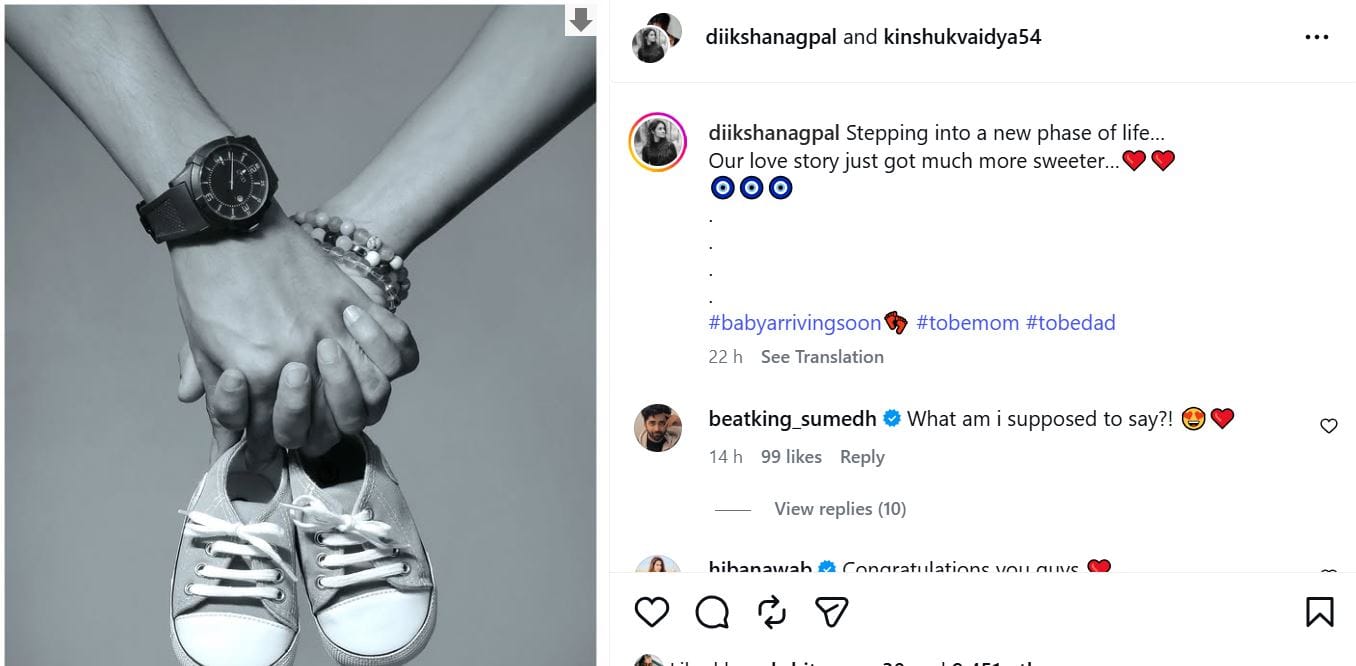 किंशुक वैद्य और उनकी पत्नी दीक्षा ने एक संयुक्त इंस्टाग्राम पोस्ट के जरिए फैंस के साथ यह खुशखबरी शेयर की है। उन्होंने एक तस्वीर शेयर की है, जिसमें दोनों एक-दूसरे का हाथ थामे दिख रहे हैं और साथ ही इनके हाथों में बेबी शूज हैं। इसके साथ कैप्शन लिखा है, 'जिंदगी के एक नए अध्याय में प्रवेश करने जा रहे हैं। हमारी प्रेम कहानी थोड़ी और मधुर हो गई है। जल्द बेबी आने वाला है'।