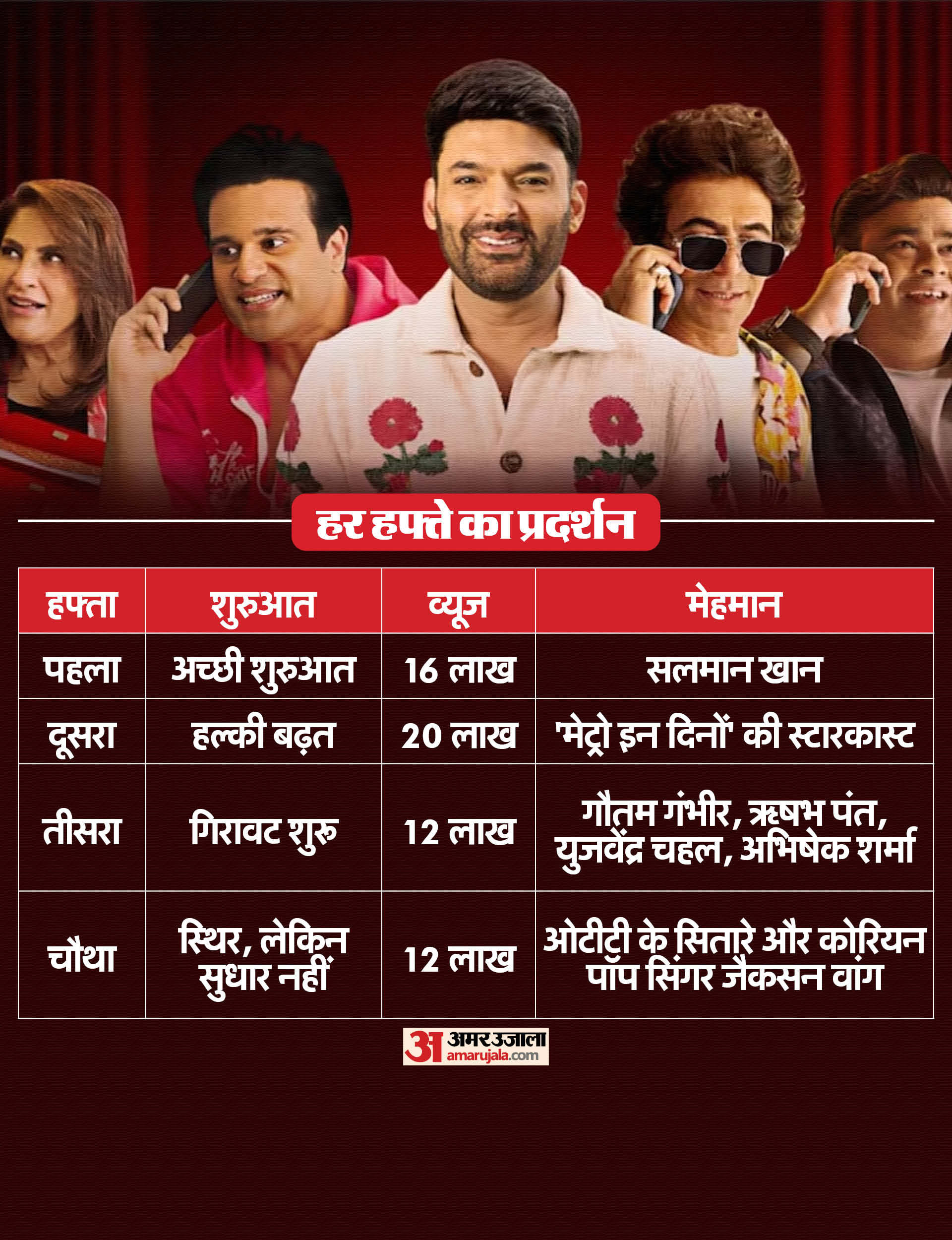 कपिल के शो के नए सीजन के पहले एपिसोड को तो अच्छी प्रतिक्रिया मिली। हालांकि, दूसरे हफ्ते में ही यह सातवें नंबर पर खिसका और तीसरे और चौथे हफ्तों में तो शो अपने ओटीटी प्लेटफॉर्म की टॉप-10 लिस्ट से ही बाहर हो गया। इससे साफ है कि कपिल के शो के इस सीजन को लोगों ने शुरुआत में तो खूब देखा, लेकिन बाद में इसकी लोकप्रियता धीरे-धीरे घटती जा रही है।