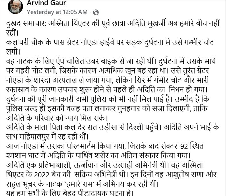 अरविंद गौर ने फेसबुक पर पोस्ट शेयर कर अदिति मुखर्जी को श्रद्धांजलि दी है। साथ ही लिखा है कि वे अस्मिता थिएटर की पूर्व छात्रा थीं। अरविंद गौर ने लिखा है, 'अस्मिता थिएटर की पूर्व छात्रा अदिति मुखर्जी अब हमारे बीच नहीं रहीं। परी चौक के पास ग्रेटर नोएडा हाईवे पर सड़क दुर्घटना मे उसे गम्भीर चोट लगी। दुर्घटना में उसके माथे पर गहरी चोट लगी, जिसके कारण अत्यधिक खून बह रहा था। उसे तत्काल ग्रेटर नोएडा के शारदा अस्पताल ले जाया गया, लेकिन सिर में गंभीर चोट और भारी रक्तस्राव के कारण उपचार शुरू होने से पहले ही अदिति का निधन हो गया'।
