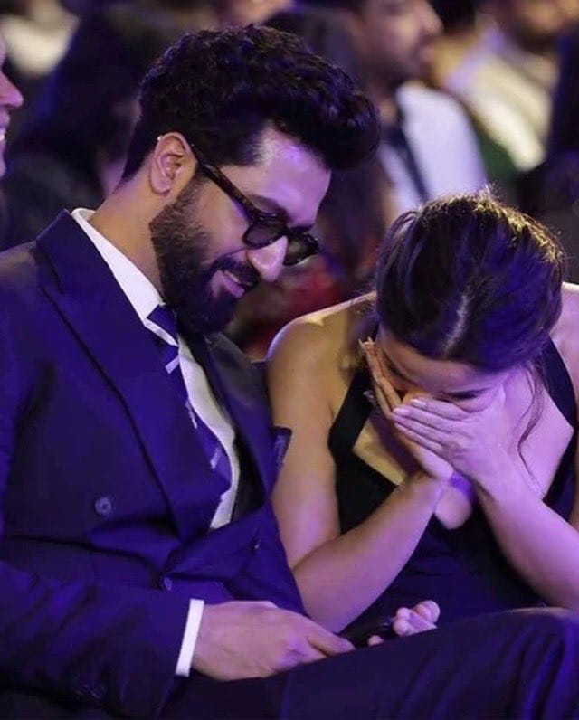 आलिया भट्ट और विक्की कौशल संजय लीला भंसाली की फिल्म 'लव एंड वॉर' में एक साथ नजर आने वाले हैं। दोनों फिल्म की शूटिंग में बिजी हैं। इस बीच दोनों कलाकार एक अवॉर्ड फंक्शन में पहुंचे। इस अवॉर्ड फंक्शन की कुछ तस्वीरें वायरल हो रही हैं। तस्वीरों में देखा जा सकता है कि दोनों एक साथ बैठे हैं। इस बीच विक्की कौशल, आलिया भट्ट को अपने फोन में कुछ दिखा रहे हैं। इस पर आलिया भट्ट ने रिएक्शन दिया है। उनका रिएक्शन सोशल मीडिया पर चर्चा का विषय बन गया है।