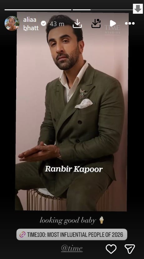 बॉलीवुड के चर्चित अभिनेता रणबीर कपूर अपनी आगामी फिल्म 'रामायण' की तैयारियों में जुटे हैं। इसका पहला पार्ट इसी साल दिवाली पर रिलीज होगा। एक्टर फिल्म में भगवान राम की भूमिका अदा करते दिखेंगे। इस बीच अभिनेता एक और वजह से भी सुर्खियां बटोर रहे हैं। दरअसल, टाइम मैग्जीन ने 2026 के 100 सबसे प्रभावशाली हस्तियों की सूची जारी की है। इस सूची में बॉलीवुड स्टार रणबीर कपूर का भी नाम शामिल है। इस पर आलिया भट्ट ने रिएक्शन दिया है।