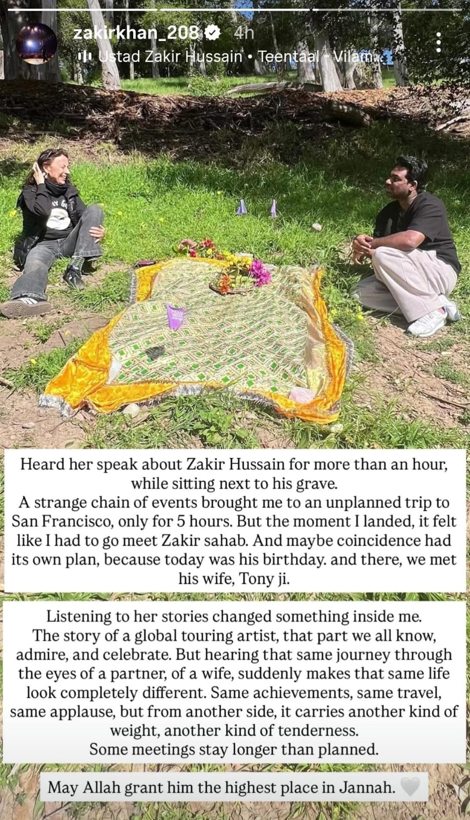 जाकिर खान अपनी इंस्टाग्राम पोस्ट पर एक तस्वीर साझा करते हैं, जिसमें दिवंगत तबला वादक जाकिर हुसैन की पत्नी भी नजर आ रही हैं। इस तस्वीर में जाकिर खान, दिवंगत जाकिर हुसैन की कब्र के पास बैठे हैं। वह अपनी पोस्ट में लिखते हैं, ‘सैन फ्रांसिस्को की यात्रा बिना किसी प्लानिंग के हुई। जब मैं इस जगह पर पहुंचा तो अचानक ख्याल आया कि जाकिर हुसैन साहब की कब्र पर जाना चाहिए। यह एक संयोग था लेकिन आज उनका जन्मदिन (9 मार्च) भी है। उनकी कब्र के पास टोनी (दिवंगत जाकिर हुसैन की पत्नी) जी भी बैठी थीं।’