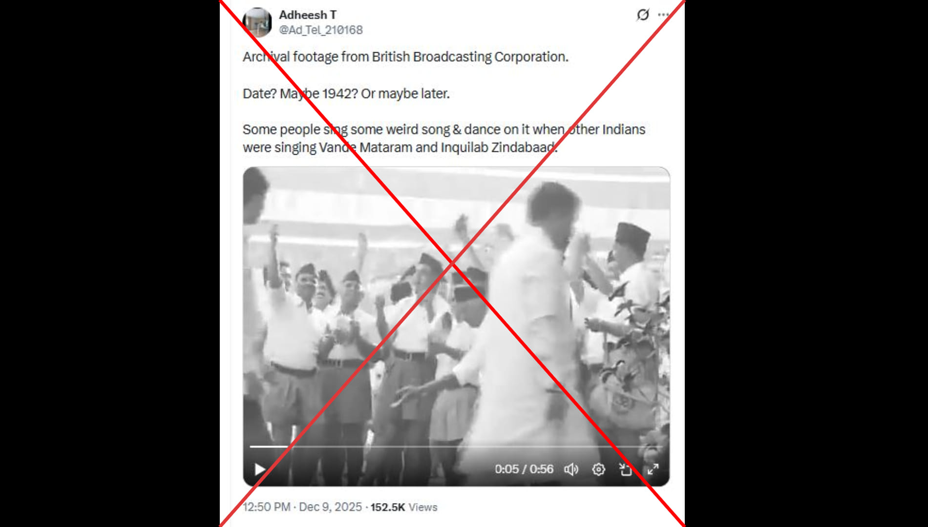 सोशल मीडिया पर इन दिनों एक वीडियो वायरल हो रहा है। वीडियो में राष्ट्रीय स्वयंसेवक संघ (आरएसएस) के कार्यकर्ता नाचते हुए नजर आ रहे हैं। वीडियो को शेयर कर दावा किया जा रहा है कि यह वीडियो 1942 का है, जब भारत के लोग वंदे मातरम और इंकलाब जिंदाबाद गा रहे थे। वहीं, कुछ लोग कोई अजीब सा गाना गाते और नाचते नजर आ रहे हैं।