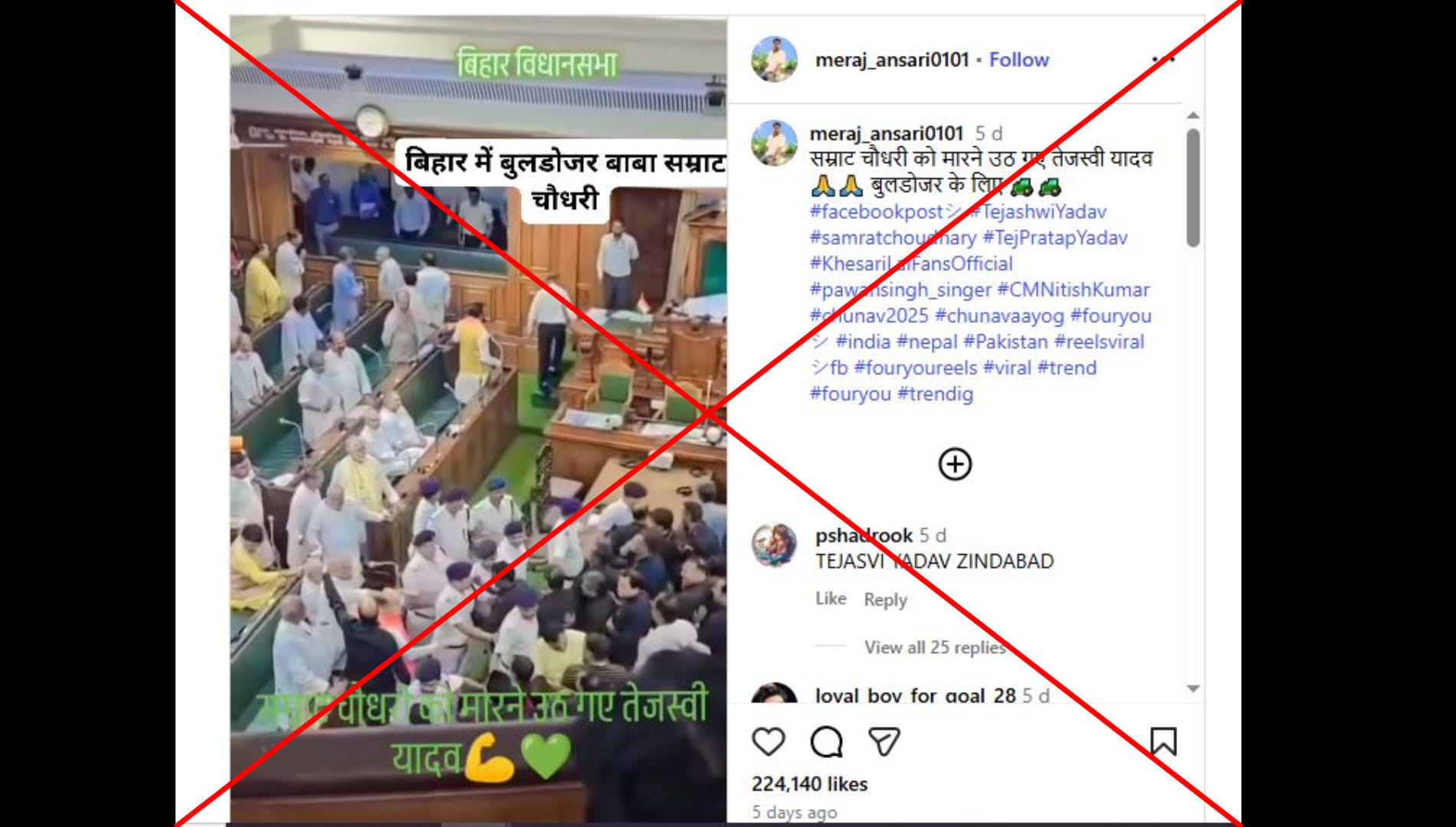 मेराज_अंसारी0101 नाम के इंस्टाग्राम यूजर ने लिखा, “सम्राट चौधरी को मारने उठ गए तेजस्वी यादव बुलडोजर के लिए।“ पोस्ट का लिंक आप यहां और आर्काइव लिंक यहां देख सकते हैं।