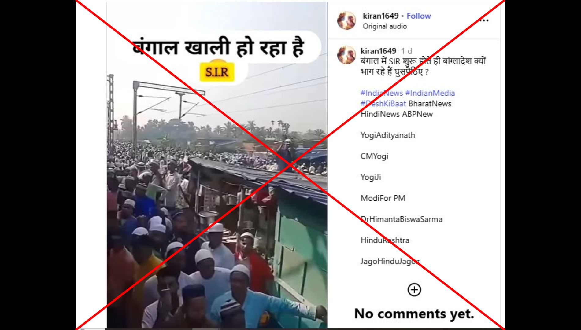 किरण1649 नाम के इंस्टाग्राम यूजर ने लिखा “ बंगाल में एसआईआर शुरू होते ही बांग्लादेश क्यों भाग रहे हैं घुसपैठिए“? पोस्ट का लिंक आप यहां और आर्काइव लिंक यहां देख सकते हैं।