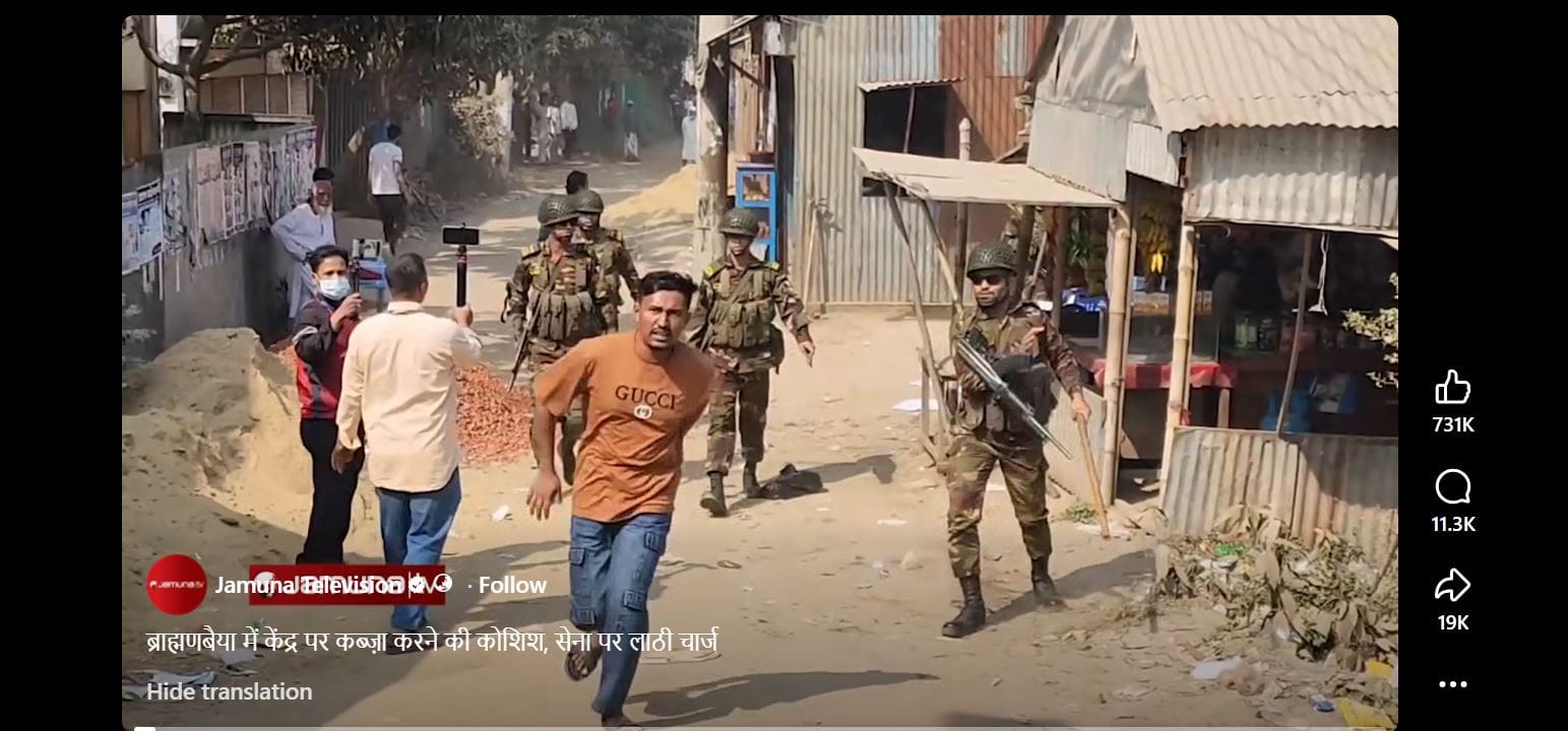 इस दावे की पड़ताल करने के लिए हमने सबसे पहले वीडियो के कीफ्रेम को गूगल रिवर्स इमेज पर सर्च किया। इस दौरान हमें जमुना टेलीविजन के फेसबुक अकाउंट पर वायरल वीडियो देखने को मिला। यह वीडियो 12 फरवरी 2026 को साझा किया गया है। इसके साथ ही यहां बताया गया है कि ब्राह्मणबारिया में केंद्र पर कब्जा करने का प्रयास, सेना का लाठीचार्ज।