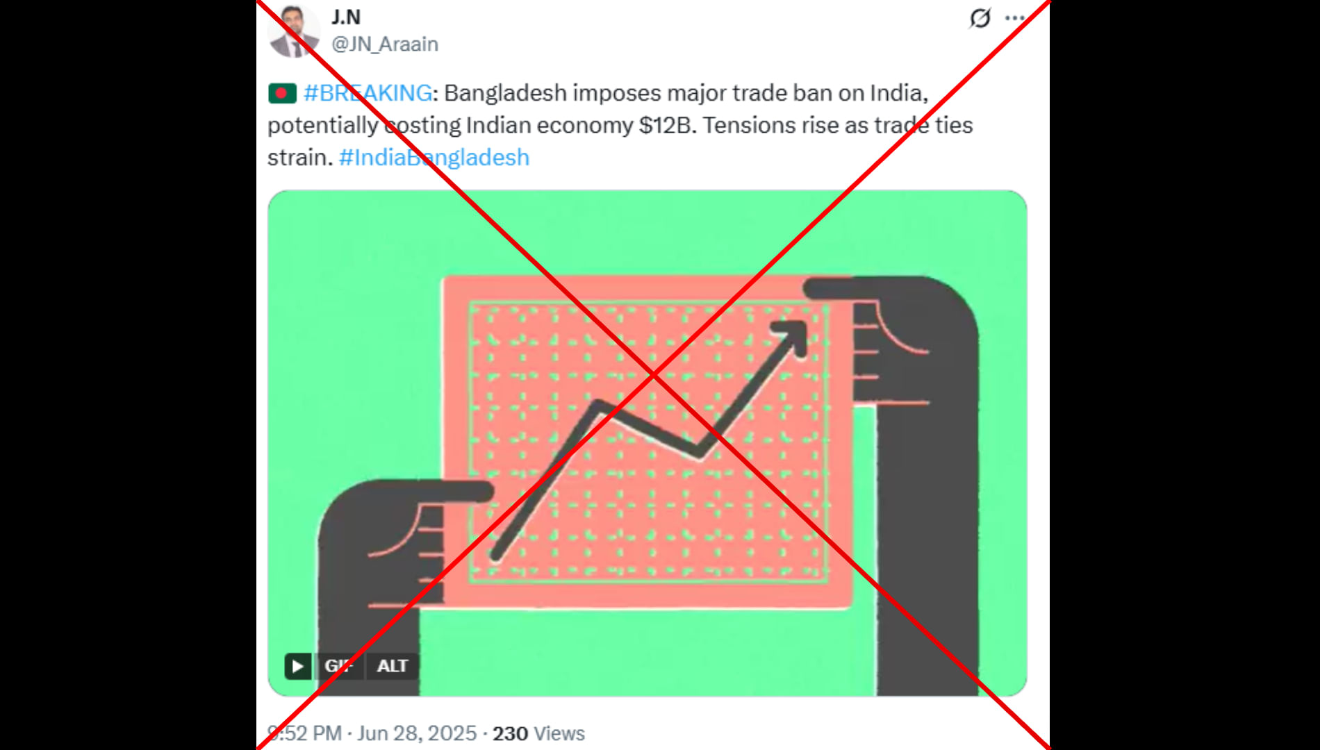 जेएन (@JN_Araain) नाम के एक्स यूजर ने लिखा “ब्रेकिंग बांग्लादेश ने भारत पर बड़ा व्यापार प्रतिबंध लगाया है, जिससे भारतीय अर्थव्यवस्था को 12 बिलियन डॉलर का नुकसान हो सकता है। व्यापार संबंधों में तनाव बढ़ा है।” पोस्ट का लिंक आप यहां और आर्काइव लिंक यहां देख सकते हैं।