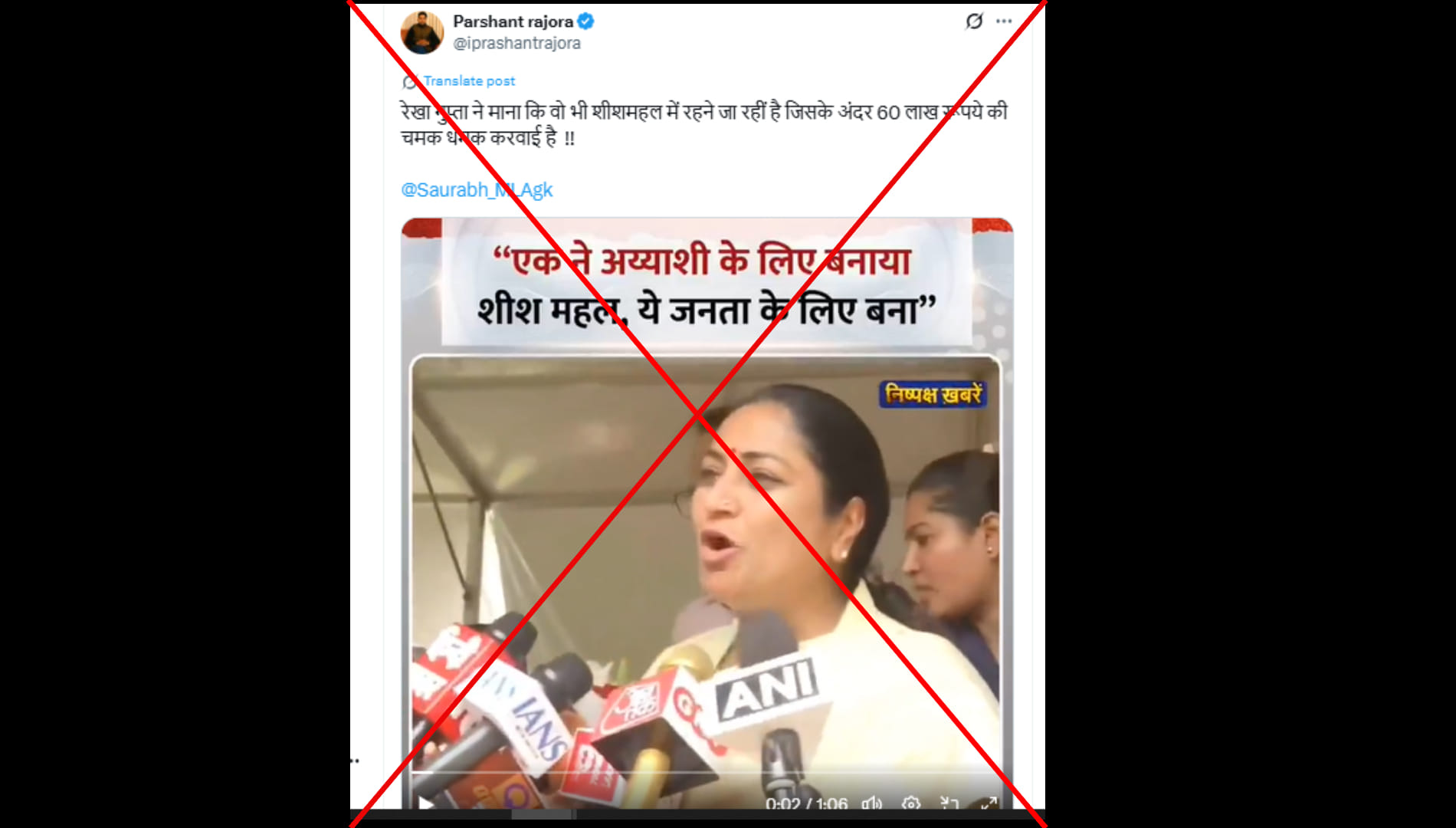 प्रशांत राजोरा (@iprashantrajora) नाम के एक्स यूजर ने लिखा ”रेखा गुप्ता ने माना कि वो भी शीशमहल में रहने जा रहीं है जिसके अंदर 60 लाख रूपये की चमक धमक करवाई है !! “ पोस्ट का लिंक आप यहां और आर्काइव लिंक यहां देख सकते हैं।