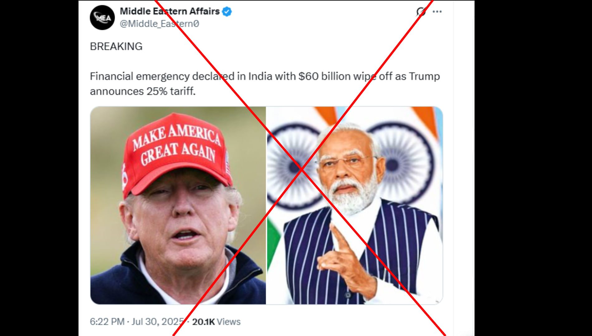 सोशल मीडिया पर पोस्ट शेयर कर दावा किया जा रहा है कि ट्रंप के टैरिफ के कारण से भारत मे वित्त आपातकाल लागू हो गया है। मिडिल ईस्ट अफेयर्स (@Middle_Eastern0) नाम के एक्स हैंडल से लिखा गया ट्रंप द्वारा 25% टैरिफ की घोषणा से भारत में वित्तीय आपातकाल का एलान, 60 अरब डॉलर का नुकसान। पोस्ट का लिंक आप यहां और आर्काइव लिंक यहां देख सकते हैं।