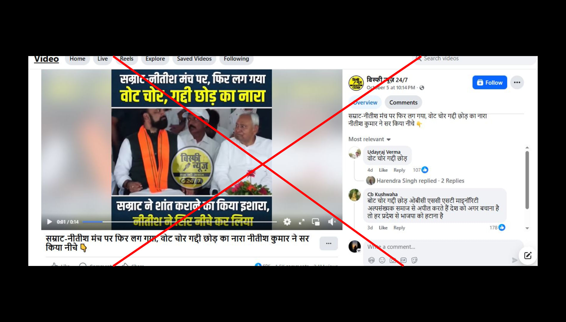 सोशल मीडिया पर एक वीडियो शेयर कर दावा किया जा रहा है कि बिहार के मुख्यमंत्री नीतीश कुमार और उपमुख्यमंत्री सम्राट चौधरी की मौजदूगी में वोट चोर, गद्दी छोड़ के नारे लगे हैं।