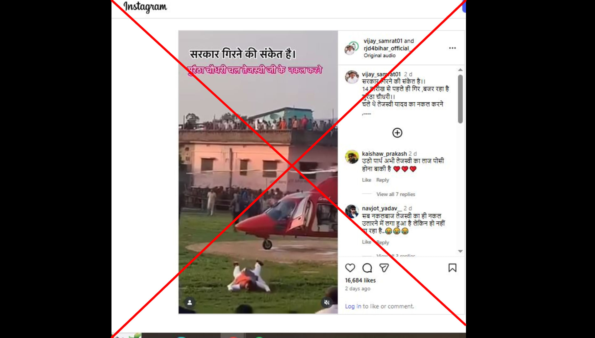 विजय सम्राट नाम के इंस्टाग्राम यूजर ने लिखा “सरकार गिरने की संकेत है। 14 तारीख से पहले ही गिर ,बजर रहा है मुरैठा चौधरी।। चल तेजस्वी यादव का नकल करने ,...... “ पोस्ट का लिंक आप यहां और आर्काइव लिंक यहां देख सकते हैं।
