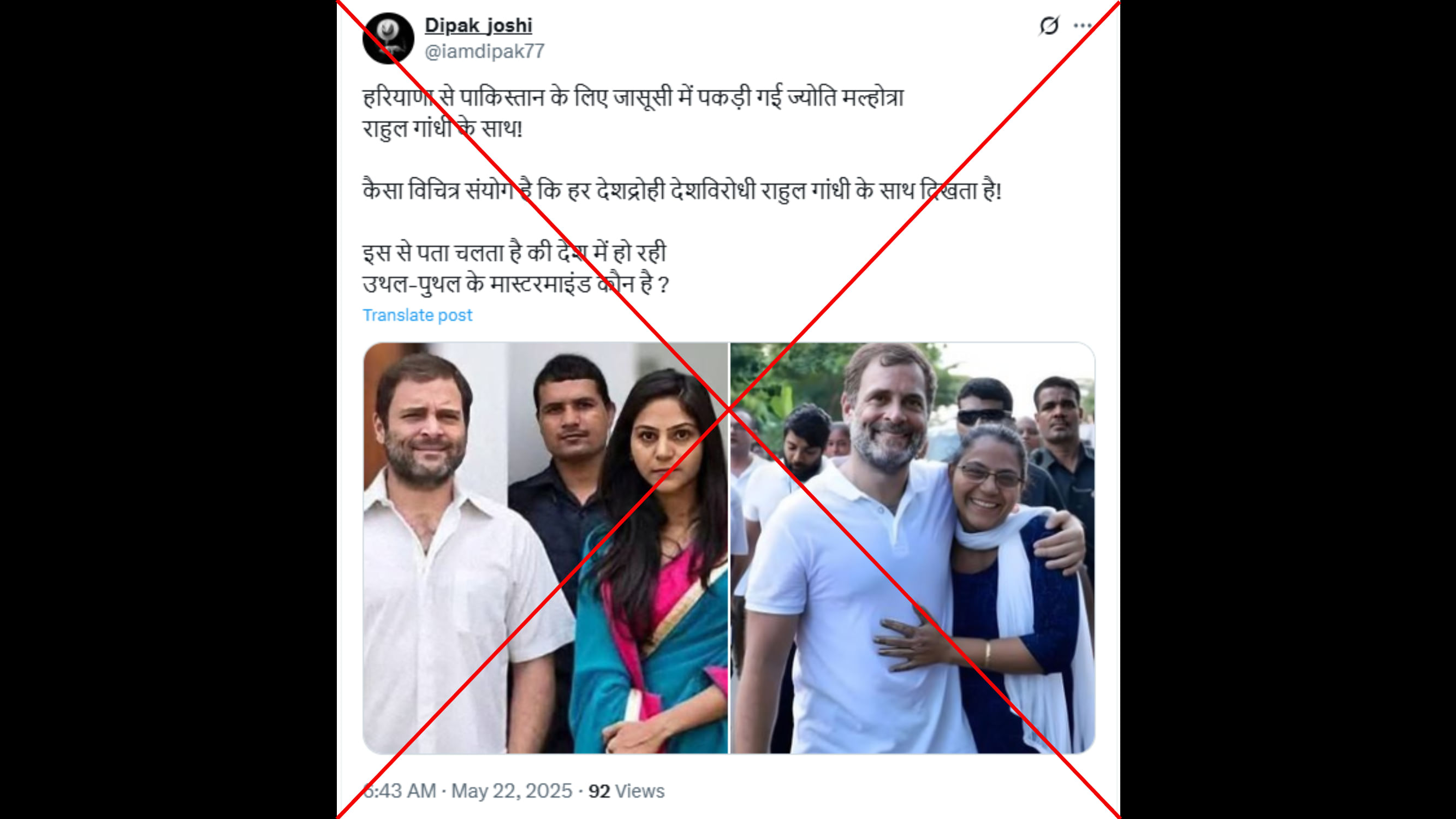 दीपक जोशी (@iamdipak77) नाम के एक एक्स यूजर ने इस तस्वीरों को शेयर करके लिखा “हरियाणा से पाकिस्तान के लिए जासूसी में पकड़ी गई ज्योति मल्होत्रा राहुल गांधी के साथ! कैसा विचित्र संयोग है कि हर देशद्रोही देशविरोधी राहुल गांधी के साथ दिखता है! इससे पता चलता है की देश में हो रही उथल-पुथल के मास्टरमाइंड कौन है?" पोस्ट का लिंक और आर्काइव लिंक आप यहां और यहां देख सकते हैं।