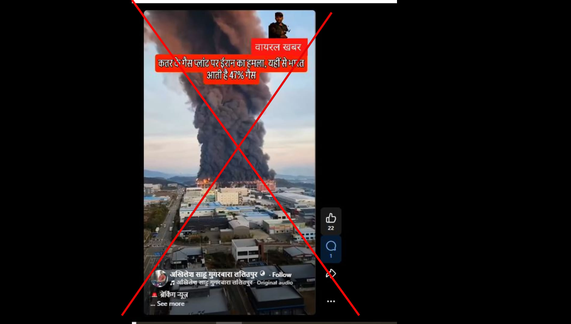 अखिलेश साहू गुगरबारा ललितपुर नाम के फेसबुक यूजर ने लिखा,”ब्रेकिंग न्यूज ईरान ने कतर के गैस प्लांट पर किया हमला! बताया जा रहा है कि यहीं से भारत को करीब 47% गैस सप्लाई होती है। क्षेत्र में बढ़ते तनाव के बीच ईरान ने अपनी घातक मिसाइल ताकत का प्रदर्शन भी किया है। विशेषज्ञों का मानना है कि इससे वैश्विक बाजार और ऊर्जा सप्लाई पर बड़ा असर पड़ सकता है। क्या इससे भारत की गैस सप्लाई पर पड़ेगा असर? आने वाले दिनों में स्थिति और गंभीर हो सकती है।” पोस्ट का लिंक आप यहां और आर्काइव लिंक यहां देख सकते हैं।