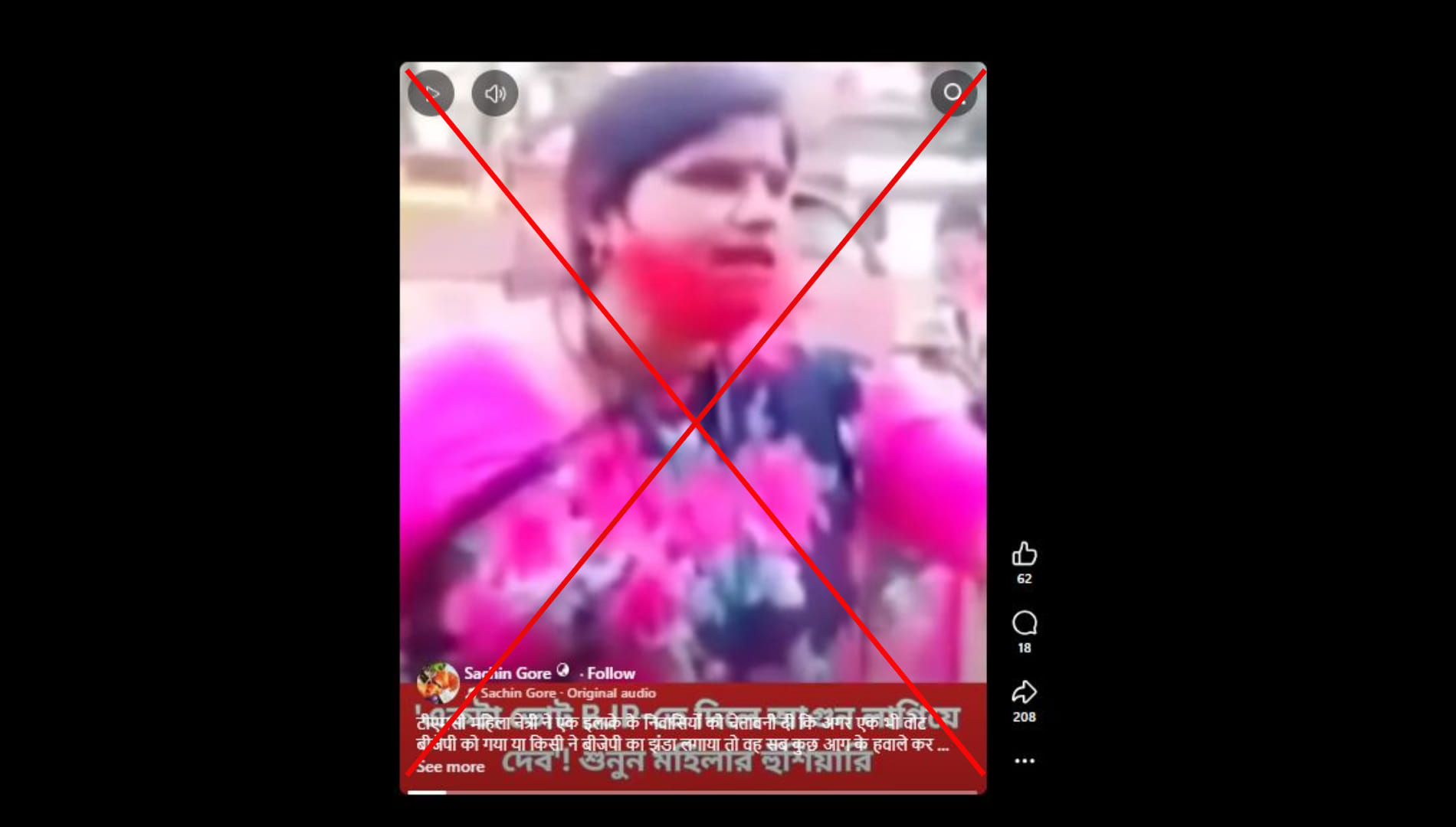 सचिन गोरे नाम के फेसबुक यूजर ने लिखा,’टीएमसी महिला नेत्री ने एक इलाके के निवासियों को चेतावनी दी कि अगर एक भी वोट बीजेपी को गया या किसी ने बीजेपी का झंडा लगाया तो वह सब कुछ आग के हवाले कर देगी। सब कुछ आग लगा देगी पुरे बस्ती में आग लगा देगी। सारे सेकुलर और बंगाल पुलिस इस पर चुप है।अगर बंगाल में बीजेपी हारी तो समझो बंगाली हिन्दुवों तुम्हे कोई नही बचा सकता।" पोस्ट का लिंक आप यहां और आर्काइव लिंक यहां देख सकते हैं।