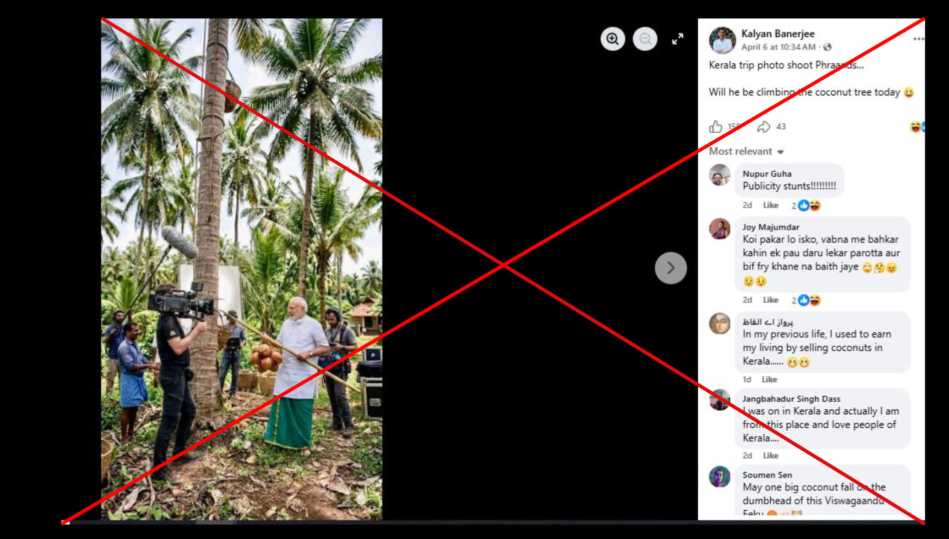 कल्याण बनर्जी नाम के फेसबुक यूजर ने लिखा,” केरल ट्रिप फोटोशूट, फ्रांड्स...क्या वो आज नारियल के पेड़ पर चढ़ेगा?” पोस्ट का लिंक आप यहां और आर्काइव लिंक यहां देख सकते हैं।