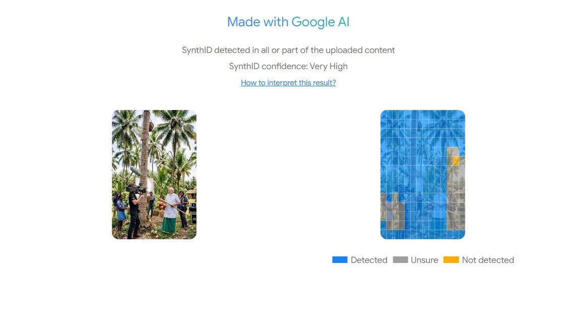इसके बाद हमने गूगल के synth ai detector टूल का इस्तेमाल किया। यह एआई डिटेक्टर टूल गूगल के एआई टूल से बनी तस्वीरों के बारे में जानकारी देता है। इस टूल ने वायरल तस्वीर को गूगल के एआई टूल से बना पाया।