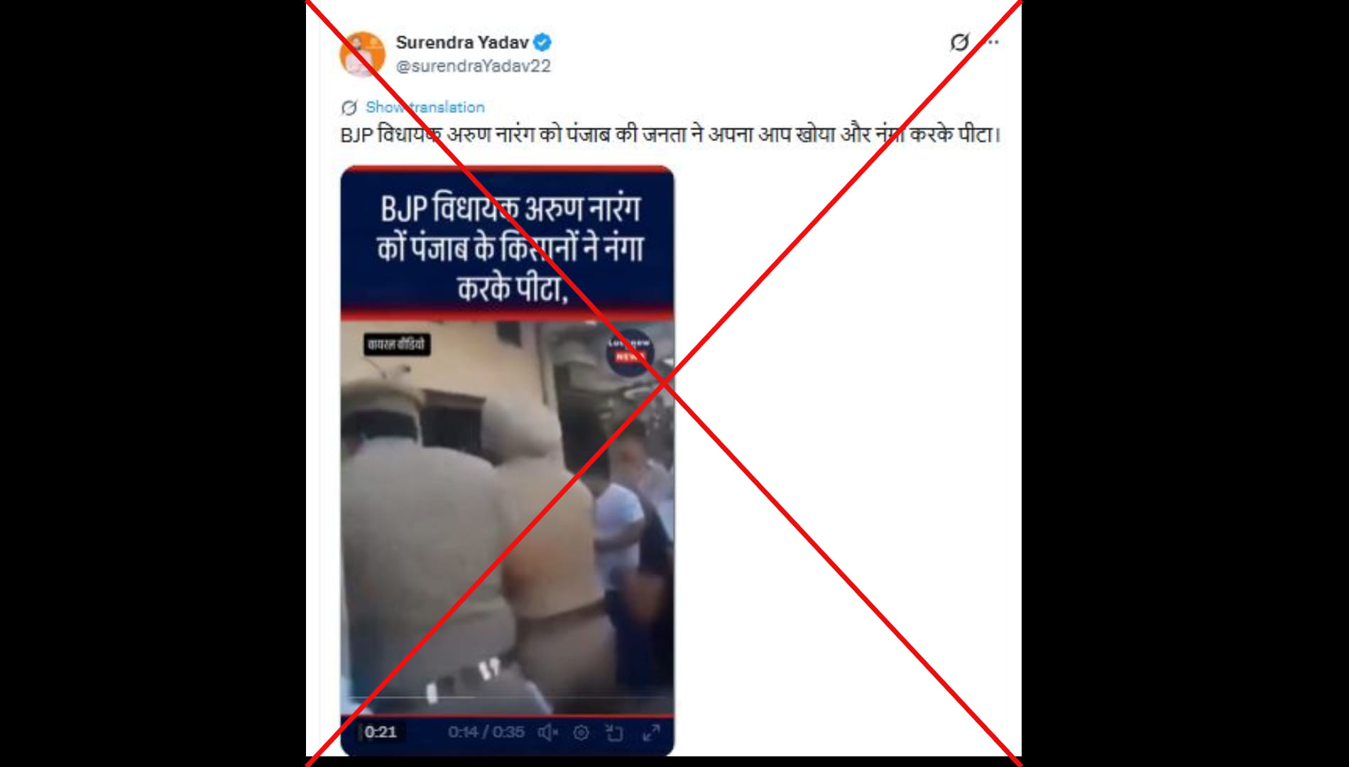 सुरेंद्र यादव (@surendraYadav22) नाम के एक्स यूजर ने लिखा, ”BJP विधायक अरुण नारंग को पंजाब की जनता ने अपना आप खोया और नंगा करके पीटा।” पोस्ट का लिंक आप यहां और आर्काइव लिंक यहां देख सकते हैं।
