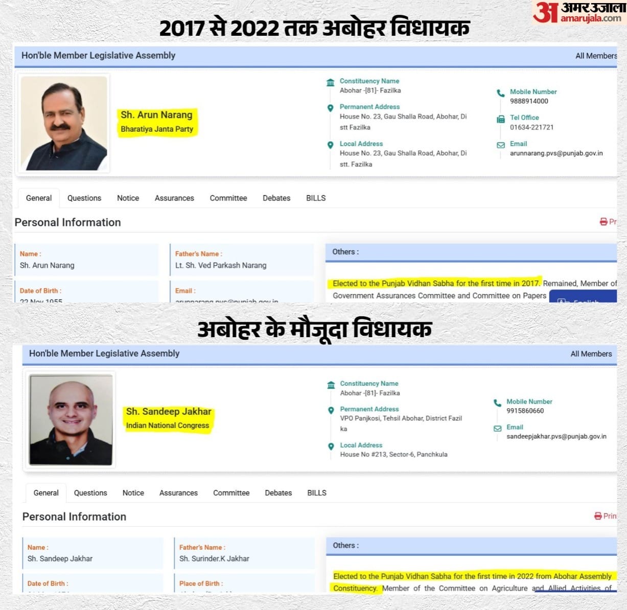 आगे की पड़ताल के लिए हमने अबोहर विधायक के बारे में पंजाब विधानसभा की वेबसाइट पर सर्च किया। यहां हमें अबोहर के मौजूदा विधायक के रूप में कांग्रेस के संदीप जाखड़ का नाम दिखा। जाखड़ 2022 में हुए विधानसभा चुनाव में यहां से चुने गए थे। इसके बाद 2017 से 2022 के दौरान अबोहर विधायक की जानकारी भी हमें पंजाब विधानसभा की साइट पर मिली। यहां विधायक के रूप में भाजपा के अरुण नारंग का नाम दर्ज था। यहां से भी साफ है कि अरुण नारंग 2022 के बाद से विधायक नहीं हैं।