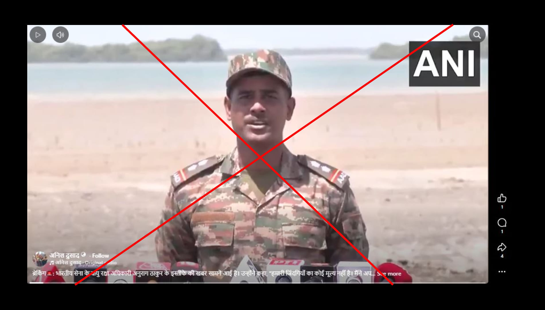 अनिल दुसाद नाम के फेसबुक यूजर ने लिखा,’ ब्रेकिंग भारतीय सेना के वायु रक्षा अधिकारी अनुराग ठाकुर के इस्तीफे की खबर सामने आई है। उन्होंने कहा, ‘हमारी जिंदगियों का कोई मूल्य नहीं है। मैंने अपने 300 साथियों को खो दिया, लेकिन भारतीय सरकार ने उनकी मृत्यु को स्वीकार तक नहीं किया। एक साल में मेरी यूनिट के तीन से अधिक अधिकारियों ने इस्तीफा दे दिया हैऔर आज मैं भी यही फैसला ले रहा हूं।’ पोस्ट का लिंक आप यहां और आर्काइव लिंक यहां देख सकते हैं।