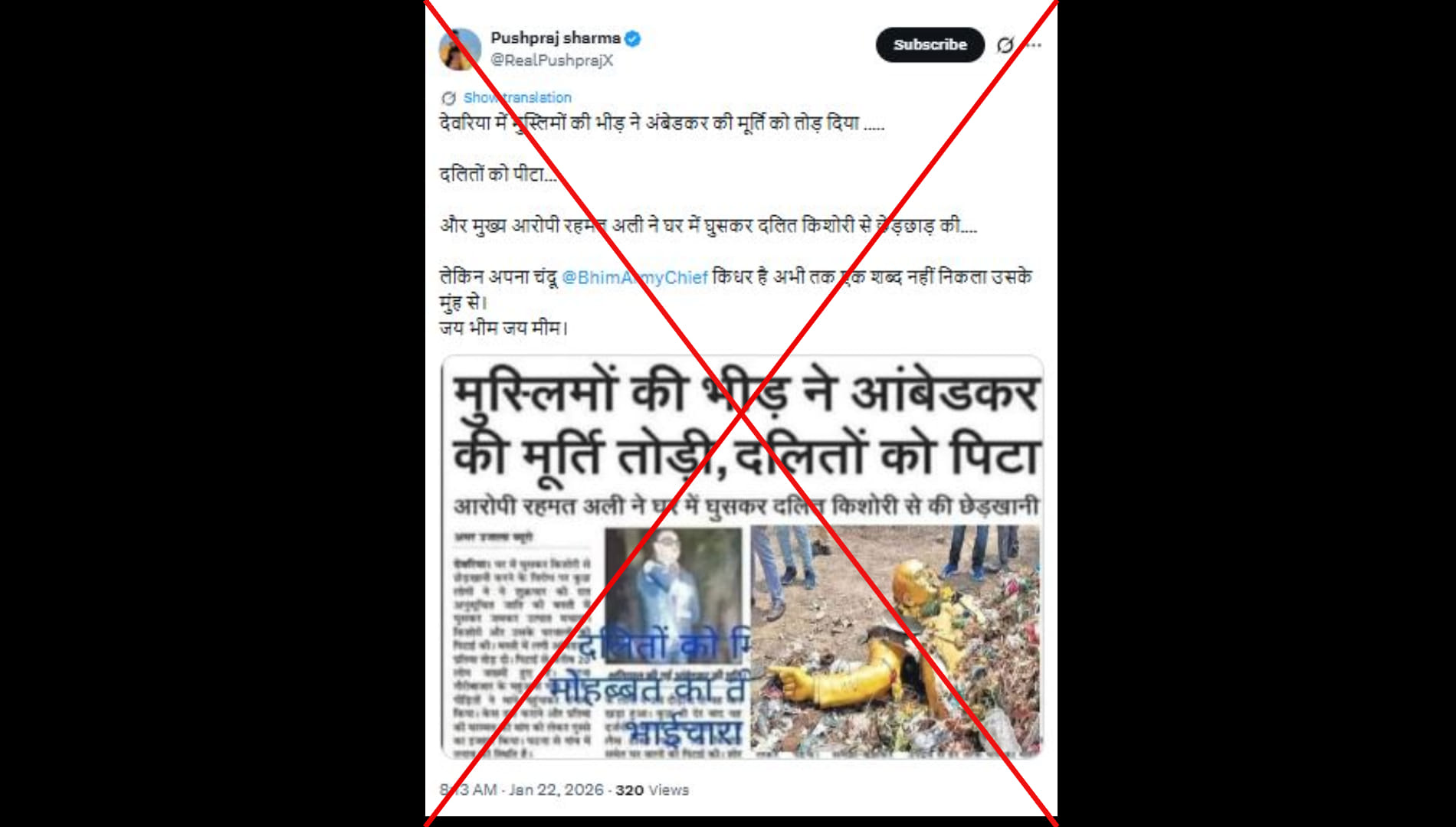 पुष्पराज शर्मा (@RealPushprajX) नाम के एक्स यूजर ने लिखा, ”देवरिया में मुस्लिमों की भीड़ ने अंबेडकर की मूर्ति को तोड़ दिया। दलितों को पीटा। और मुख्य आरोपी रहमत अली ने घर में घुसकर दलित किशोरी से छेड़छाड़ की। लेकिन अपना चंदू चंद्र शेखर आजाद किधर है अभी तक एक शब्द नहीं निकला उसके मुंह से। जय भीम जय मीम।'' पोस्ट का लिंक आप यहां और आर्काइव लिंक यहां देख सकते हैं।