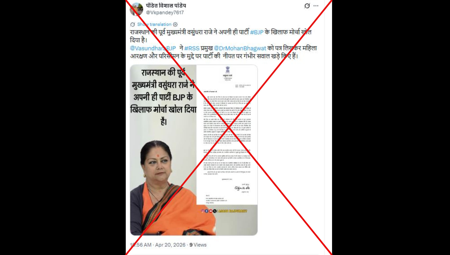 पंडित विशाल पांडेय (@Vkpandey7617) नाम के एक्स यूजर ने लिखा, 'राजस्थान की पूर्व मुख्यमंत्री वसुंधरा राजे ने अपनी ही पार्टी भाजपा के खिलाफ मोर्चा खोल दिया है। वसुंधरा राजे ने आरआरएस के प्रमुख मोहन भागवत को पत्र लिखकर महिला आरक्षण और परिसीमन के मुद्दे पर पार्टी की नीयत पर गंभीर सवाल खड़े किए हैं।' पोस्ट का लिंक आप यहां और आर्काइव लिंक यहां देख सकते हैं।