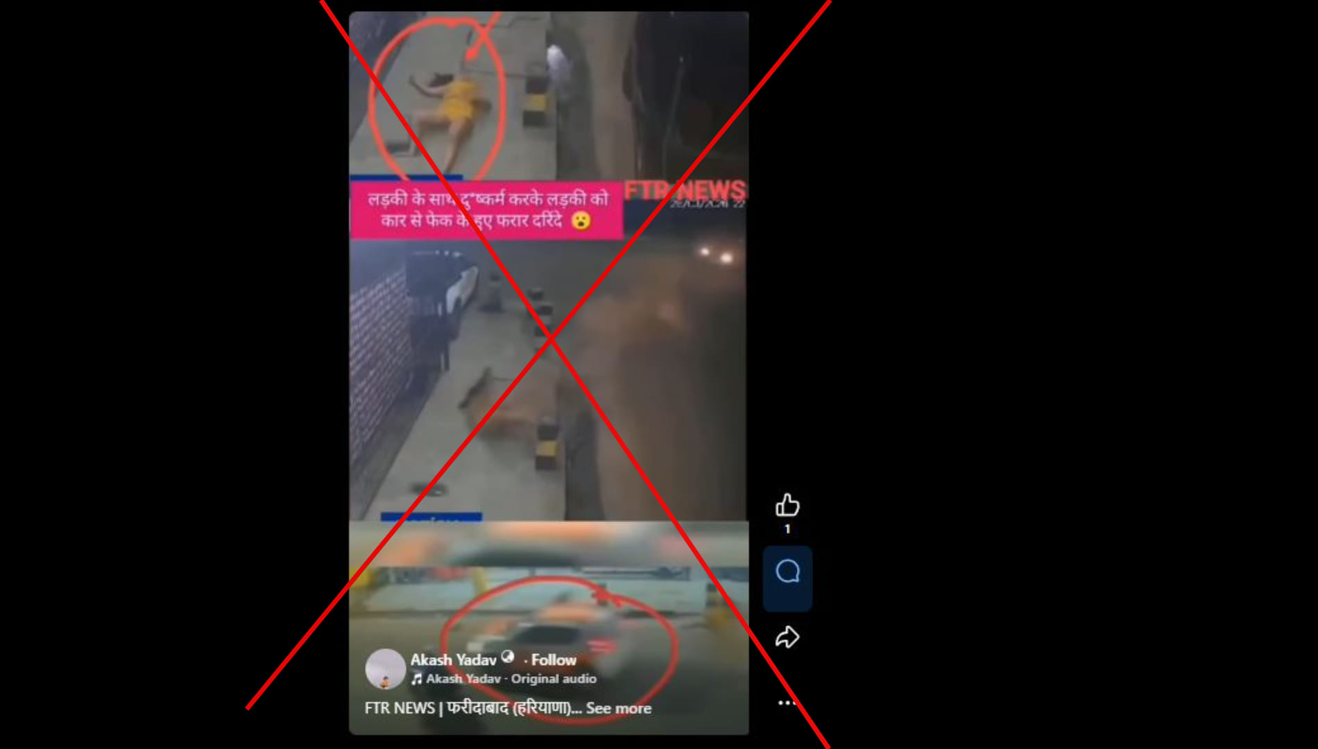 आकाश यादव नाम के फेसबुक यूजर ने लिखा,’FTR NEWS | फरीदाबाद (हरियाणा) हेडिंग: दुष्कर्म के बाद युवती को चलती कार से फेंका, आरोपी फरार, वीडियो वायरल... खबर: फरीदाबाद से जुड़ा एक बेहद गंभीर और झकझोर देने वाला मामला सामने आया है, जिसका वीडियो सोशल मीडिया पर तेजी से वायरल हो रहा है। वीडियो में दावा किया जा रहा है कि दुष्कर्म के बाद युवती को चलती कार से डिवाइडर पर फेंक दिया गया और आरोपी मौके से फरार हो गए।’ पोस्ट का लिंक आप यहां और आर्काइव लिंक यहां देख सकते हैं।