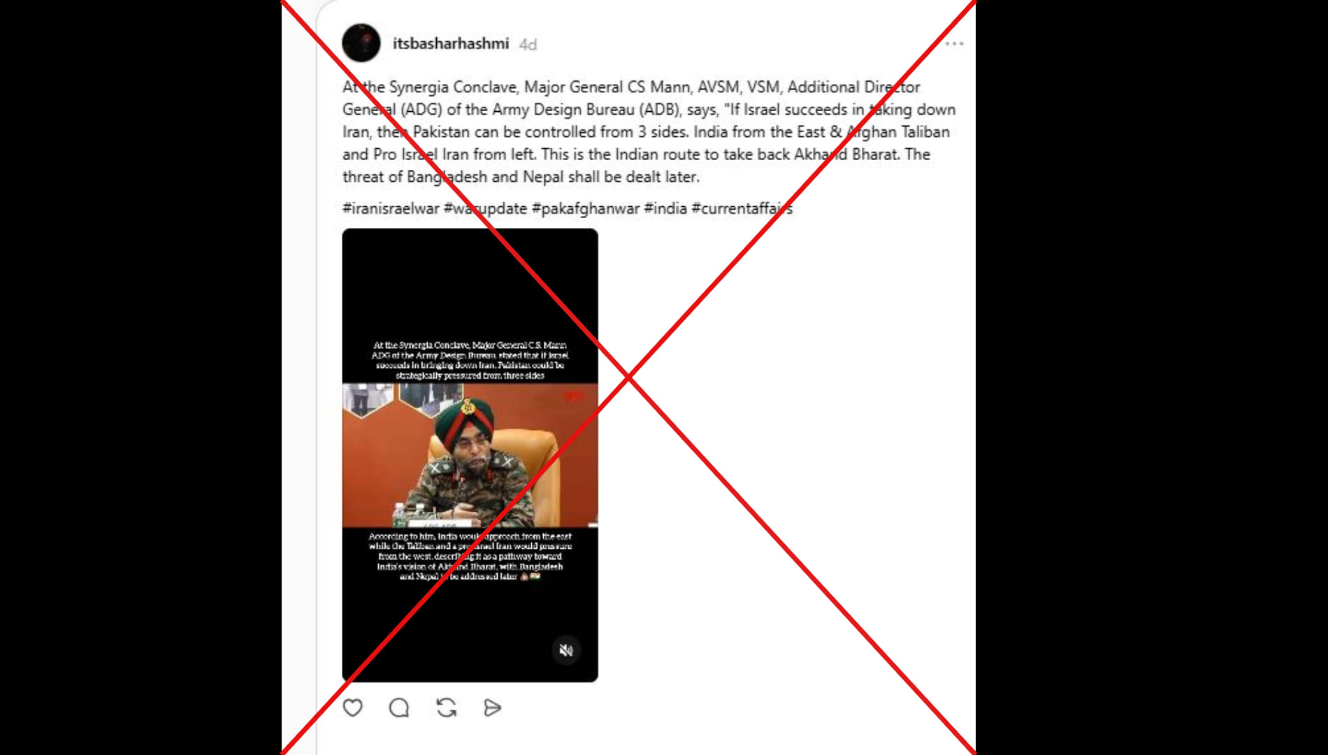 बशर हाशमी नाम के थ्रेड्स यूजर ने लिखा,”सिनर्जिया सम्मेलन में, सेना डिजाइन ब्यूरो (एडीबी) के अतिरिक्त महानिदेशक (एडीजी) मेजर जनरल सीएस मान, एवीएसएम, वीएसएम ने कहा, "यदि इस्राइल ईरान को हराने में सफल हो जाता है, तो पाकिस्तान को तीन तरफ से नियंत्रित किया जा सकता है। पूर्व से भारत और बाईं ओर से अफगान तालिबान और इस्राइल समर्थक ईरान। यही भारत का अखंड भारत को वापस लेने का रास्ता है। बांग्लादेश और नेपाल के खतरे से बाद में निपटा जाएगा।" पोस्ट का लिंक आप यहां और आर्काइव लिंक यहां देख सकते हैं।
