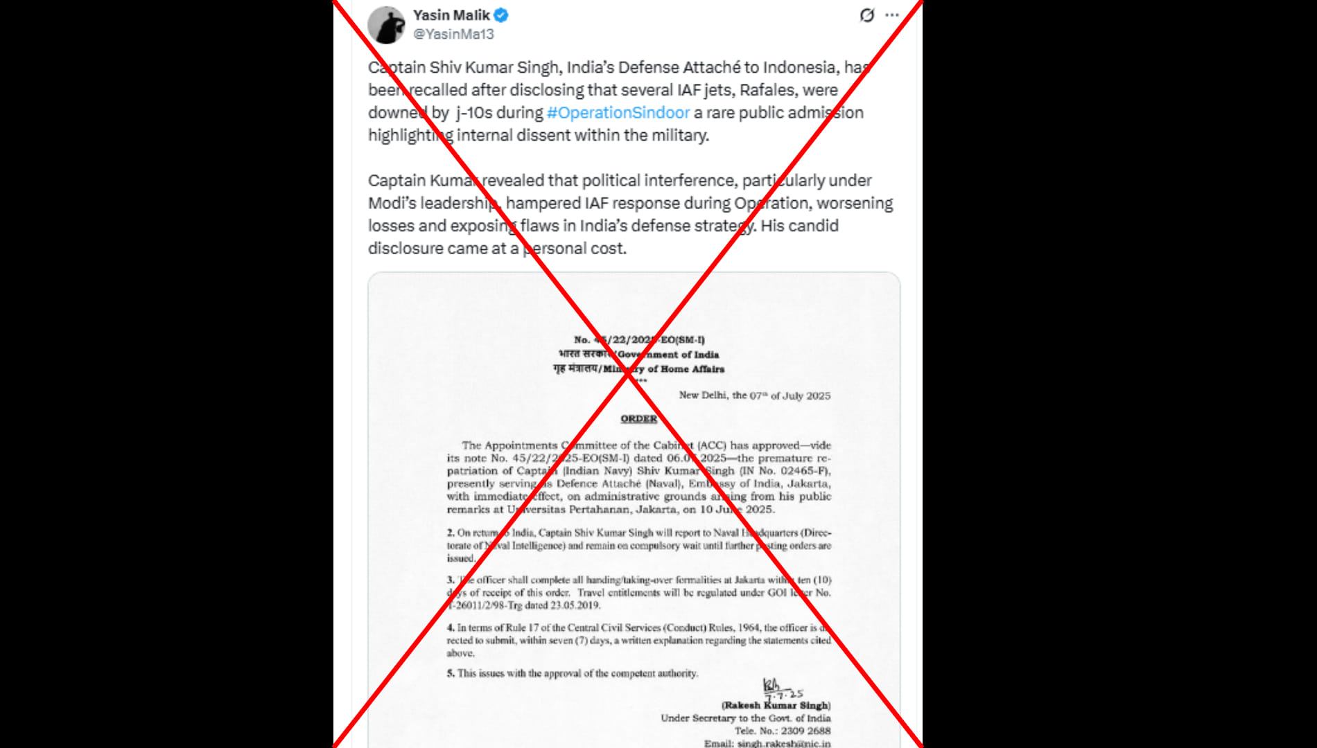 यासीन मलिक (@YasinMa13) नाम के यूजर ने लिखा “इंडोनेशिया में भारत के रक्षा अताशे कैप्टन शिव कुमार सिंह को यह खुलासा करने के बाद वापस बुला लिया गया है कि ऑपरेशन सिंदूर के दौरान कई भारतीय वायुसेना के जेट, राफेल, जे-10 विमानों द्वारा गिराए गए थे। यह एक दुर्लभ सार्वजनिक स्वीकारोक्ति है जो सेना के भीतर आंतरिक असंतोष को उजागर करती है।” पोस्ट का लिंक आप यहां और आर्काइव लिंक यहां देख सकते हैं।